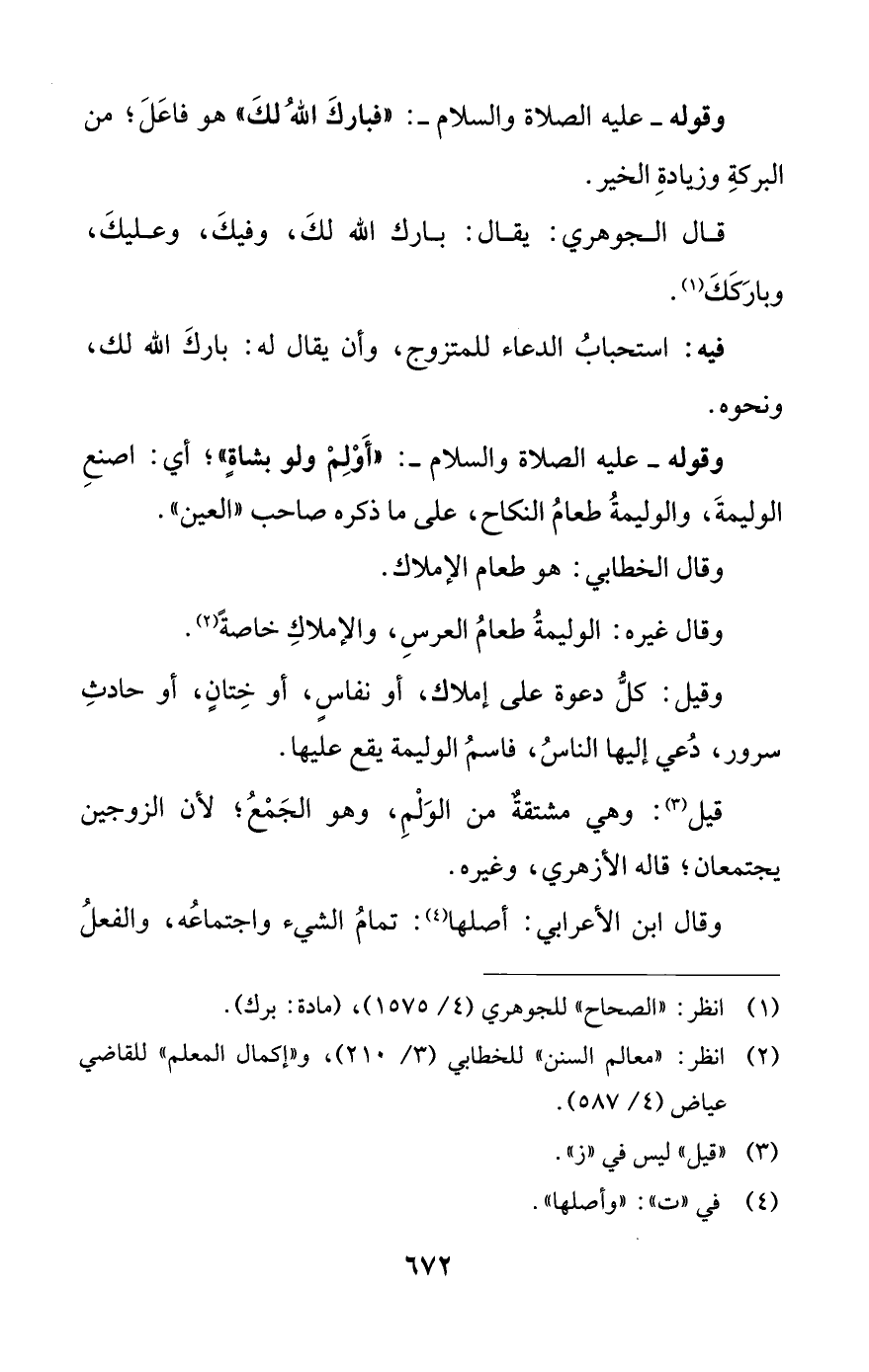وقوله -عليه الصلاة والسلام-: "أَوْلِمْ ولو بشاةٍ"؛ أي: اصنعِ الوليمةَ، والوليمةُ طعامُ النكاح، على ما ذكره صاحب "العين".