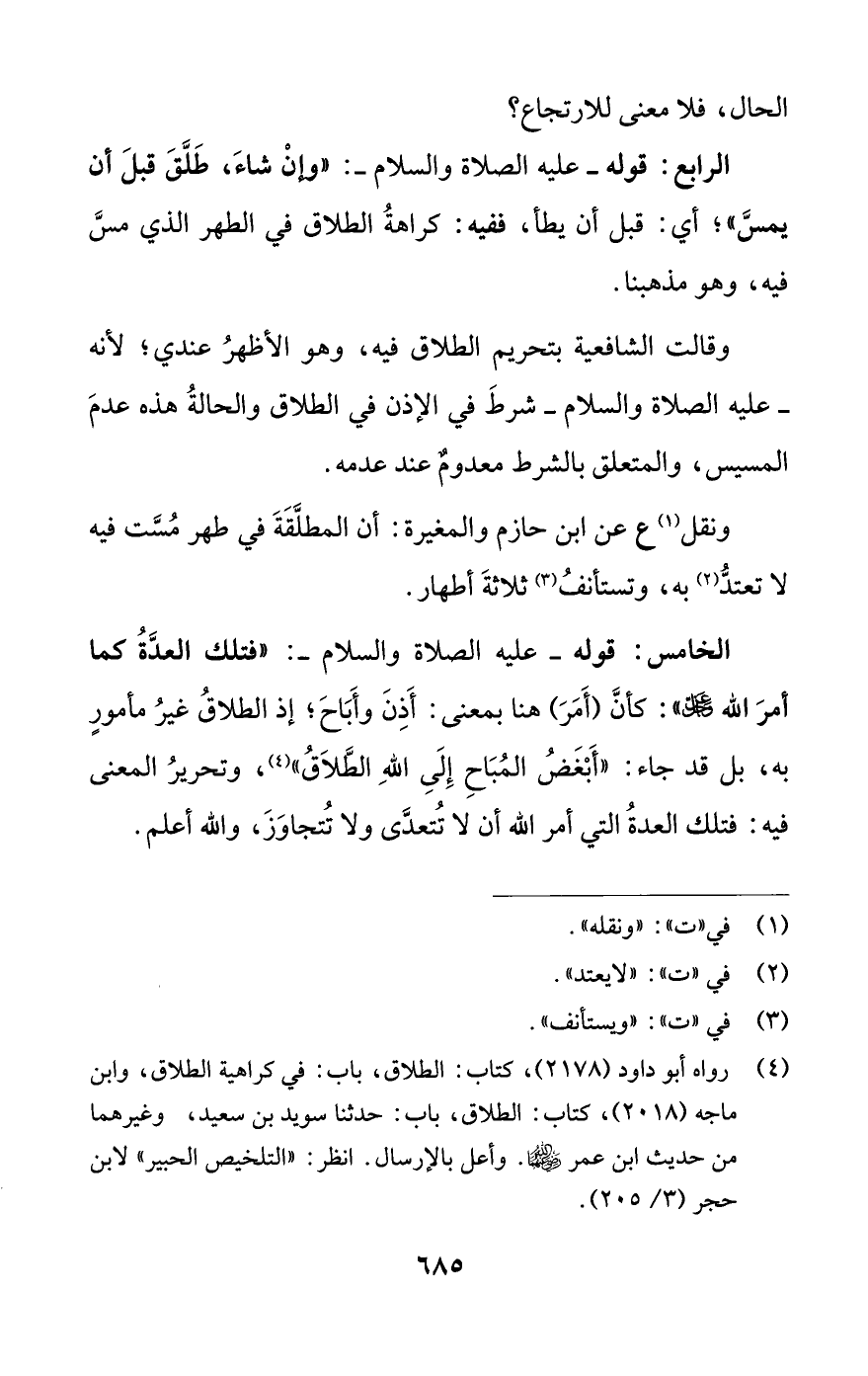 (¬4) رواه أبو داود (2178)، كتاب: الطلاق، باب: في كراهية الطلاق، وابن ماجه (2018)، كتاب: الطلاق، باب: حدثنا سويد بن سعيد، وغيرهما من حديث ابن عمر -رضي اللَّه عنهما-. وأعل بالإرسال. انظر: "التلخيص الحبير" لابن حجر (3/ 205).