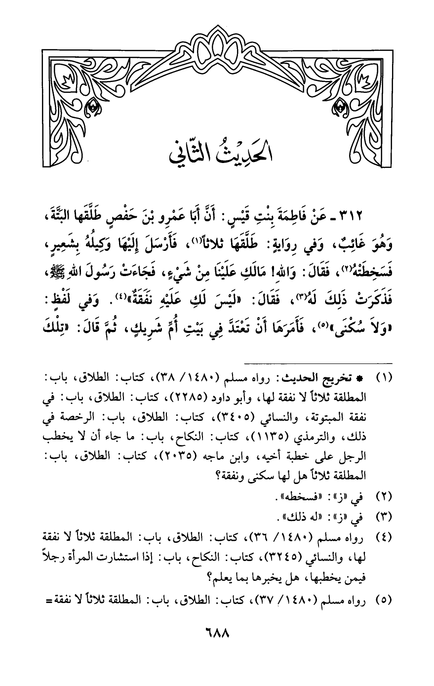 312 - عَنْ فَاطِمَةَ بِنْتِ قَيْسٍ: أَنَّ أَبَا عَمْرِو بْنَ حَفْصٍ طَلَّقَها البَتَّةَ، وَهُوَ غَائِبٌ، وَفي رِوَايةٍ: طَلَّقَهَا ثلاثًا (¬1)، فَأَرْسَلَ إِلَيْهَا وَكيلُهُ بِشَعِيرٍ، فَسَخِطَتْه (¬2)، فَقَالَ: وَاللَّهِ! مَالَكِ عَلَيْنَا مِنْ شَيْءٍ، فَجَاءَتْ رَسُولَ اللَّه -صلى اللَّه عليه وسلم-، فَذَكَرَتْ ذَلِكَ لَه (¬3)، فَقَالَ: "لَيْسَ لَكِ عَلَيْهِ نَفَقَة" (¬4). وَفي لَفْظٍ: "وَلَا سُكْنَى" (¬5)، فَأمَرَهَا أَنْ تَعْتَدَّ فِي بَيْتِ أُمِّ شَرِيكٍ، ثُمَّ قَالَ: "تِلْكَ