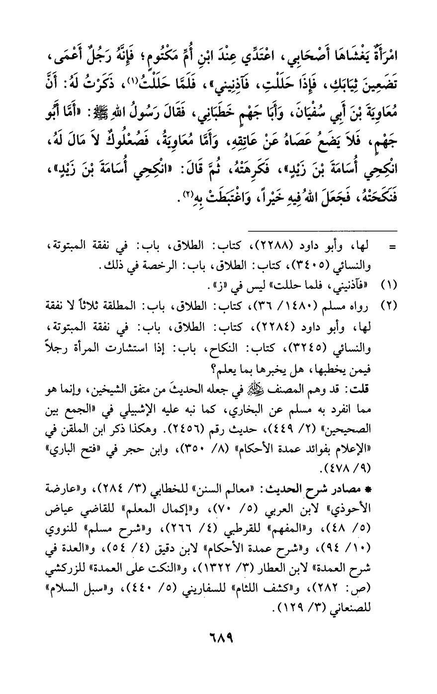 (¬2) رواه مسلم (1480/ 36)، كتاب: الطلاق، باب: المطلقة ثلاثًا لا نفقة لها، وأبو داود (2284)، كتاب: الطلاق، باب: في نفقة المبتوتة، والنسائي (3245)، كتاب: النكاح، باب: إذا استشارت المرأة رجلًا فيمن يخطبها، هل يخبرها بما يعلم؟
