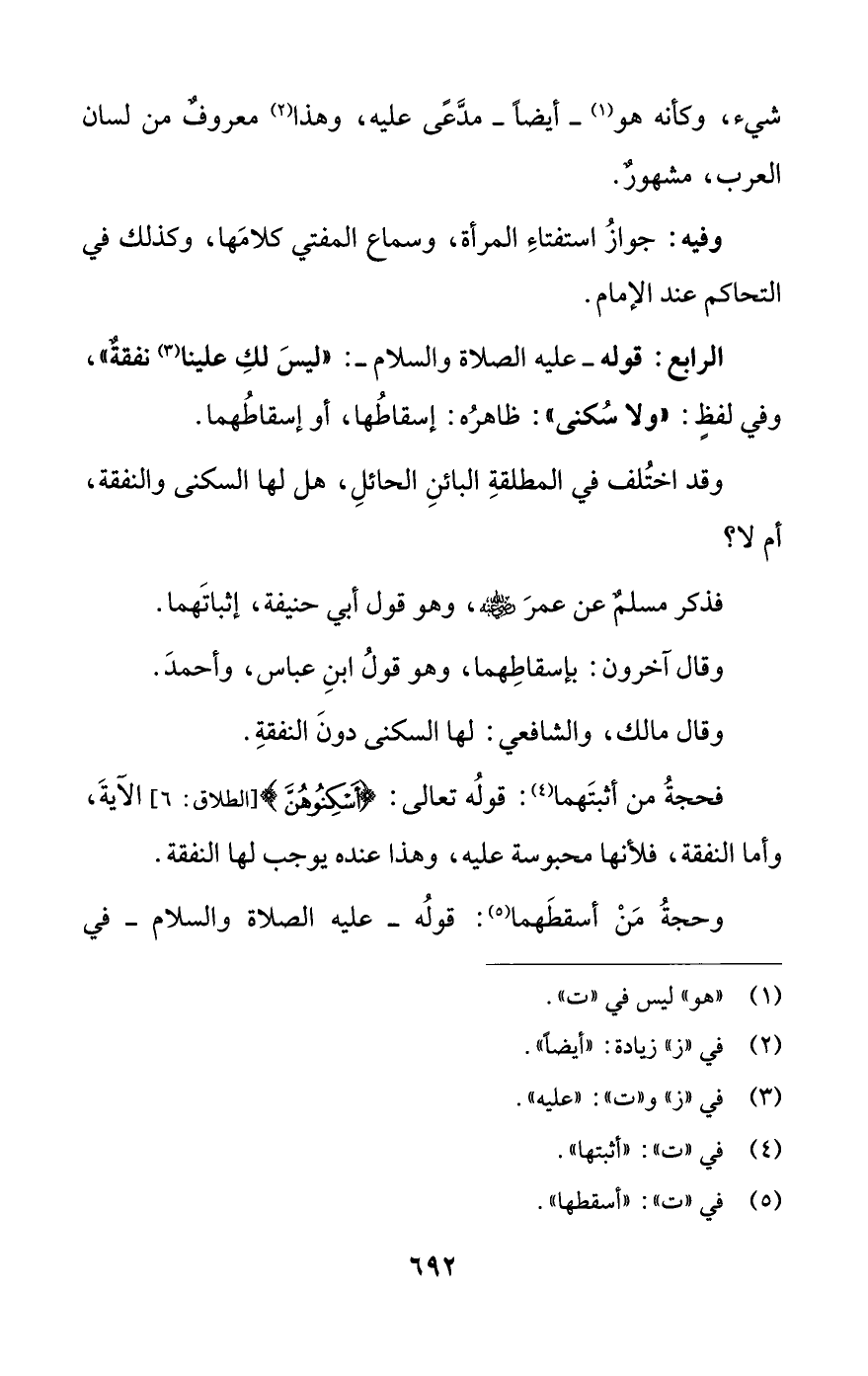 الرابع: قوله -عليه الصلاة والسلام-: "ليسَ لكِ علينا (¬3) نفقةٌ"، وفي لفظٍ: "ولا سُكنى": ظاهرُه: إسقاطُها، أو إسقاطُهما.
