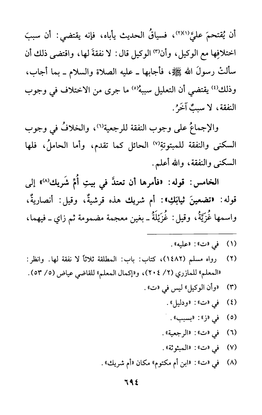 (¬2) رواه مسلم (1482)، كتاب: باب: المطلقة ثلاثًا لا نفقة لها. وانظر: "المعلم" للمازري (2/ 204)، و"إكمال المعلم" للقاضي عياض (5/ 53).