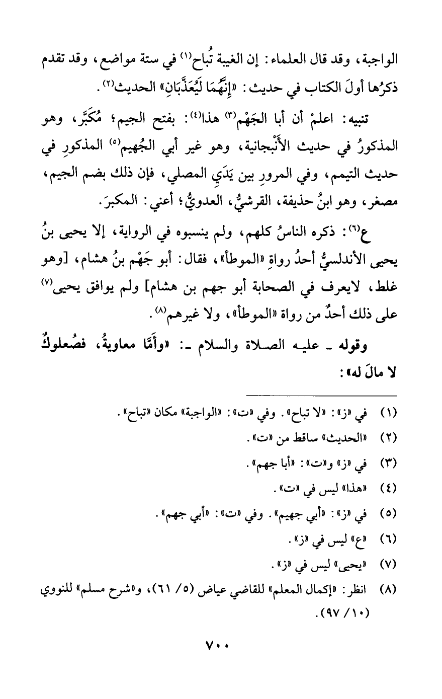 ع (¬6): ذكره الناسُ كلهم، ولم ينسبوه في الرواية، إلا يحيى بنُ يحيى الأندلسيُّ أحدُ رواةِ "الموطأ"، فقال: أبو جَهْم بنُ هشام، [وهو غلط، لا يعرف في الصحابة أبو جهم بن هشام] ولم يوافق يحيى (¬7) على ذلك أحدٌ من رواة "الموطأ"، ولا غيرهم (¬8).