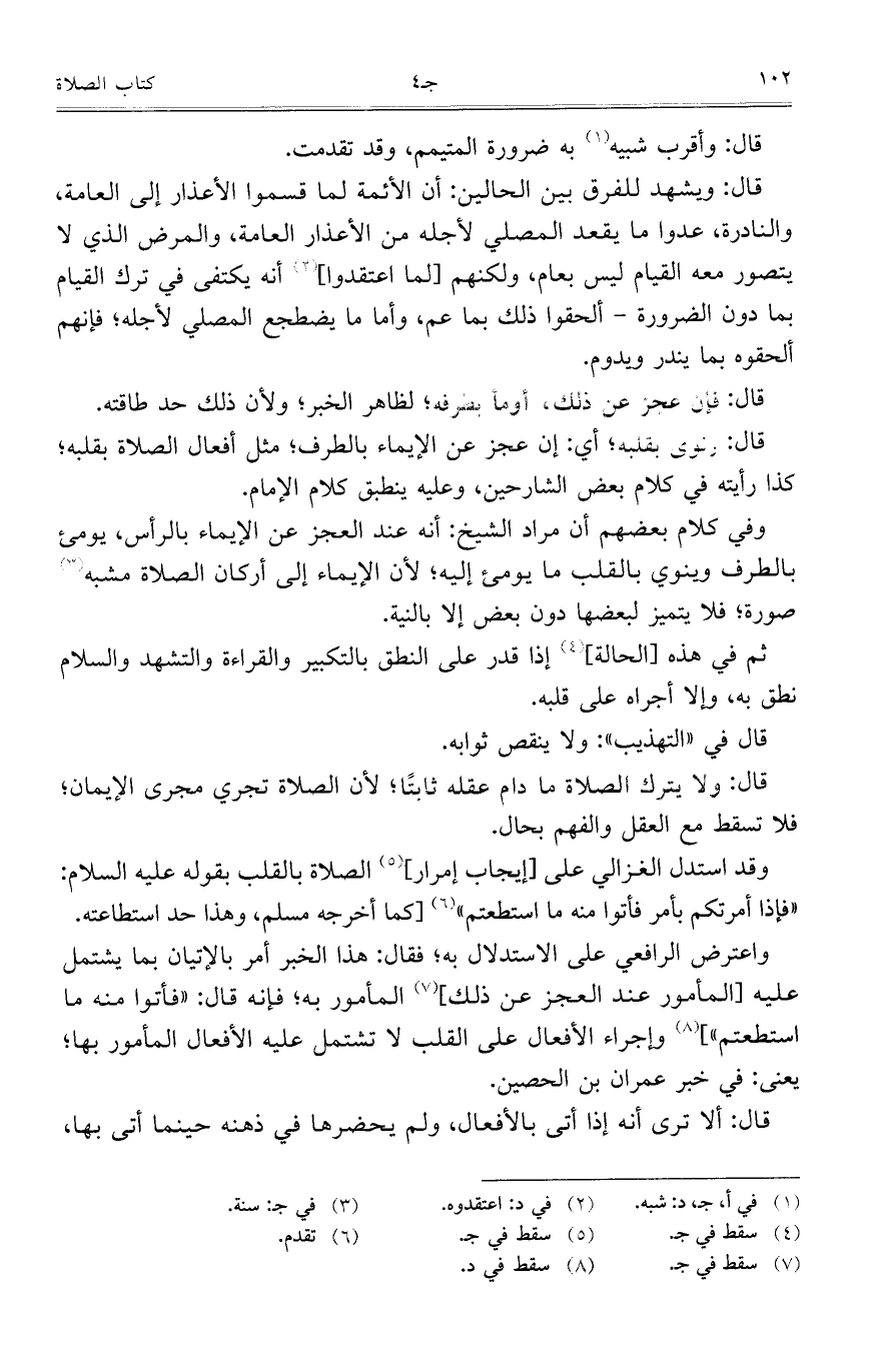واعترض الرافعي على الاستدلال به؛ فقال: هذا الخبر أمر بالإتيان بما يشتمل عليه [المأمور عند العجز عن ذلك] المأمور به؛ فإنه قال: "فأتوا منه ما استطعتم"] وإجراء الأفعال على القلب لا تشتمل عليه الأفعال المأمور بها؛ يعنى: في خبر عمران بن الحصين.