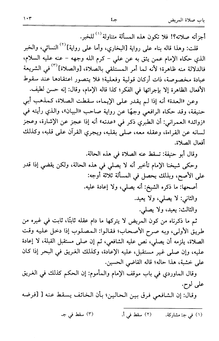 قلت: وهذا قاله بناء على رواية [البخاري، وأما على رواية] النسائي، والخبر الذي حكاه الإمام عمن يثق به عن علي - كرم الله وجهه - عنه عليه السلام، فالدلالة منه ظاهرة؛ لأنه لما أمر المستلقي بالصلاة، [والصلاة] في الشريعة عبادة مخصوصة، ذات أركان قولية وفعلية؛ فلا يتصور اعتقادها عند سقوط الأفعال الظاهرة إلا بإجرائها في الفكر؛ كذا قاله الإمام، وقال: إنه حسن لطيف.
