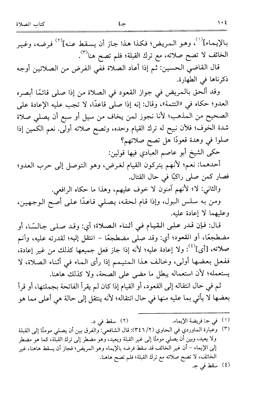 وقد ألحق بالمريض فى جواز القعود فى الصلاة من إذا صلى قائماً أبصره العدو؛ حكاه في "التتمة"، وقال: إنه إذا صلى قاعداً، لا تجب عليه الإعادة على الصحيح من المذهب؛ لأنا نجوز لمن يخاف من سيل أو سبع أن يصلي صلاة شدة الخوف؛ فلأن نبيح له ترك القيام وحده، وتصح صلاته أولى. نعم الكمين إذا صلوا في وهدة قعوداً هل تصح صلاتهم؟