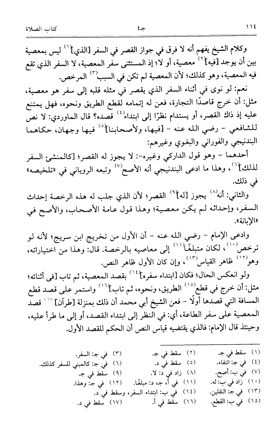 ولو انعكس الحال؛ فكان [ابتداء سفره] بقصد المعصية، ثم تاب [فى أثنائه؛ مثل: أن خرج في قطع الطريق، ونحوه، ثم تاب] واستمر على قصد قطع المسافة التي قصدها أولاً - فعن الشيخ أبي محمد أن ذلك بمنزلة [طرآن] قصد المعصية على سفر الطاعة، أي: في النظر إلى ابتداء القصد، أو إلى ما طرأ عليه، وحينئذ قال الإمام: فالذي يقتضيه قياس النص أن الحكم للقصد الأول.