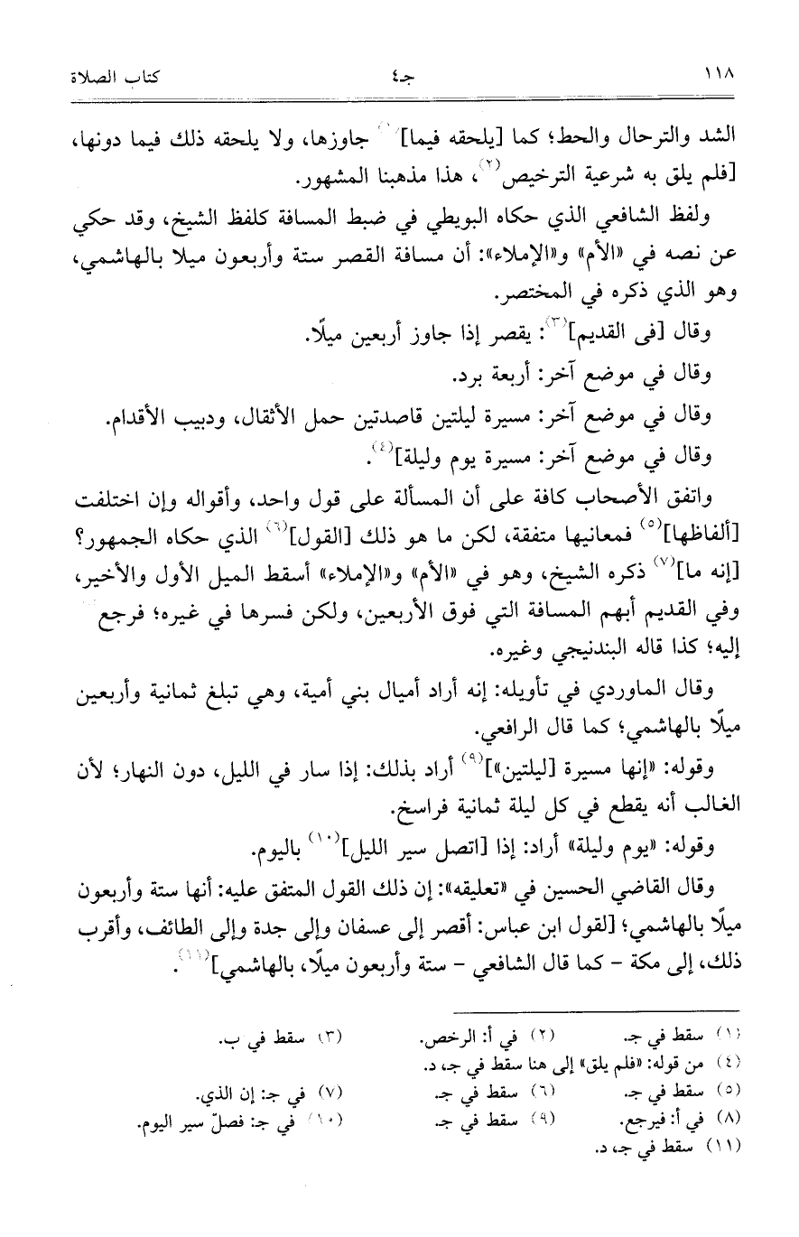 ولفظ الشافعي الذي حكاه البويطي في ضبط المسافة كلفظ الشيخ، وقد حكى عن نصه في "الأم" و"الإملاء": أن مسافة القصر ستة وأربعون ميلاً بالهاشمي، وهو الذي ذكره في المختصر.