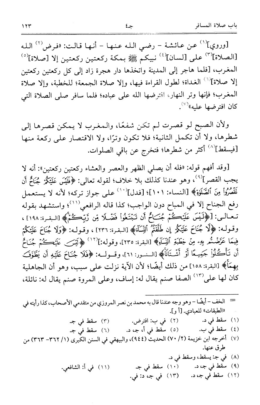 [وروي] عن عائشة- رضي الله عنها- أنها قالت: "فرض الله [الصلاة] على [لسان] نبيكم صلى الله عليه وسلم بمكة ركعتين ركعتين إلا [صلاة] المغرب، [فلما هاجر إلى المدينة واتخذها دار هجرة زاد إلى كل ركعتين ركعتين إلا صلاة] الغداة؛ لطول القراءة فيها، وإلا صلاة الجمعة؛ للخطبة، وإلا صلاة المغرب؛ فإنها وتر النهار، افترضها الله على عباده؛ فلما سافر صلى الصلاة التي كان افترضها عليه".