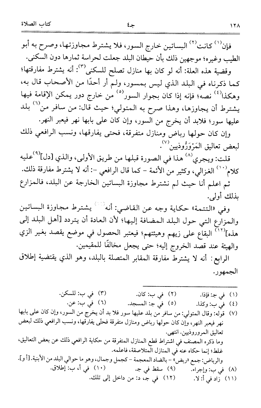 وقضية هذه العلة: أنه لو كان بها منازل تصلح للسكنى: أنه يشترط مفارقتها؛ كما ذكرناه في البلد الذي ليس بمسور، ولم أر أحداً من الأصحاب قال به، وهكذا نصه؛ فإنه إذا كان بجوار السور من خارج دور يمكن الإقامة فيها يشترط أن يجاوزها، وهذا صرح به المتولي؛ حيث قال: من سافر من بلد عليها سور؛ فلابد أن يخرج من السور، وإن كان على بابها نهر فيعبر النهر.