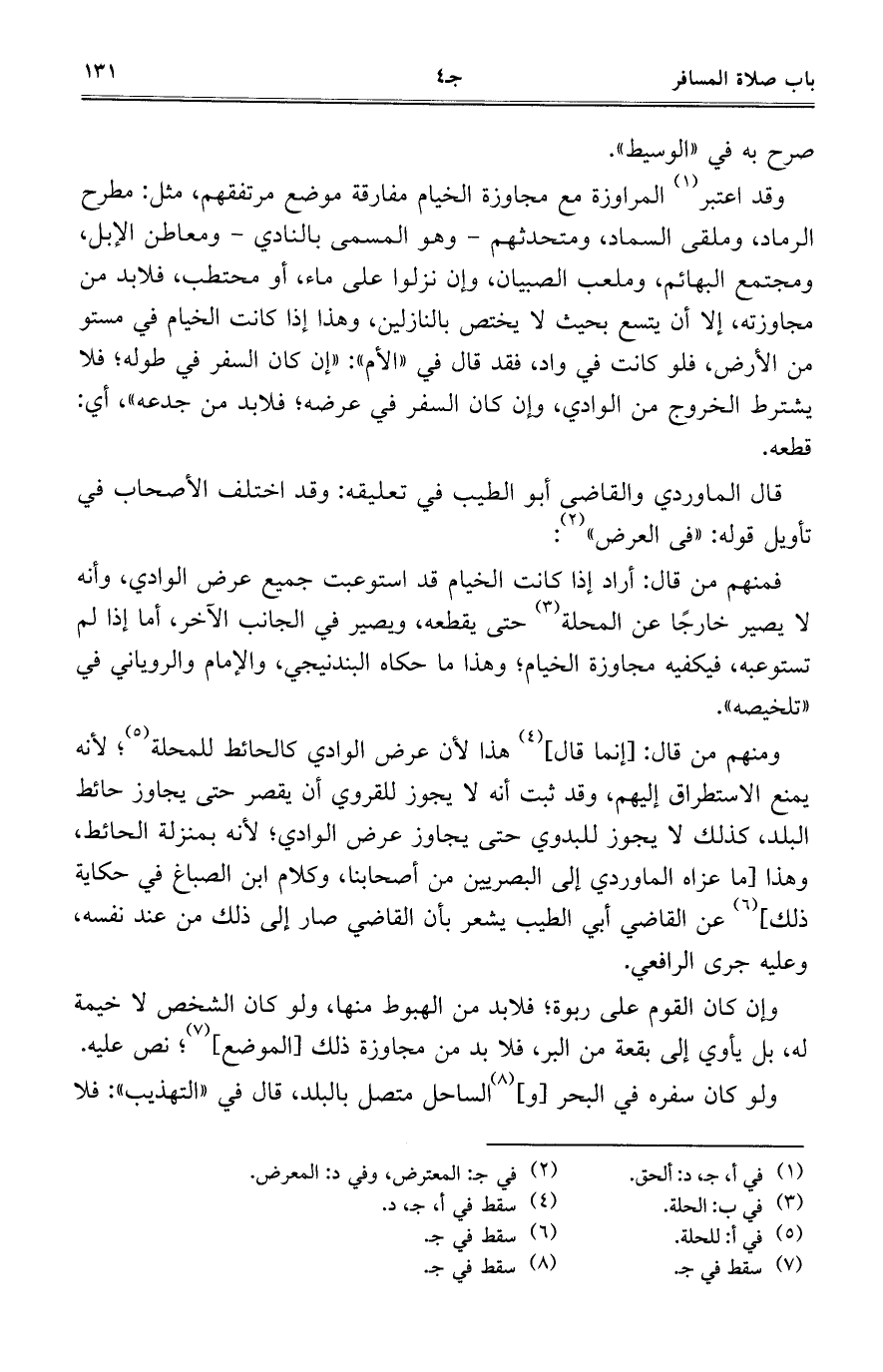 وقد اعتبر المراوزة مع مجاوزة الخيام مفارقة موضع مرتفقهم، مثل: مطرح الرماد، وملقى السماد، ومتحدثهم – وهو المسمى بالنادي- ومعاطن الإبل، ومجتمع البهائم، وملعب الصبيان، وإن نزلوا على ماء، أو محتطب، فلابد من مجاوزته، إلا أن يتسع بحيث لا يختص بالنازلين، وهذا إذا كانت الخيام في مستو من الأرض، فلو كانت في واد، فقد قال في "الأم": "إن كان السفر في طوله؛ فلا يشترط الخروج من الوادي، وإن كان السفر في عرضه؛ فلابد من جدعه"، أي: قطعه.