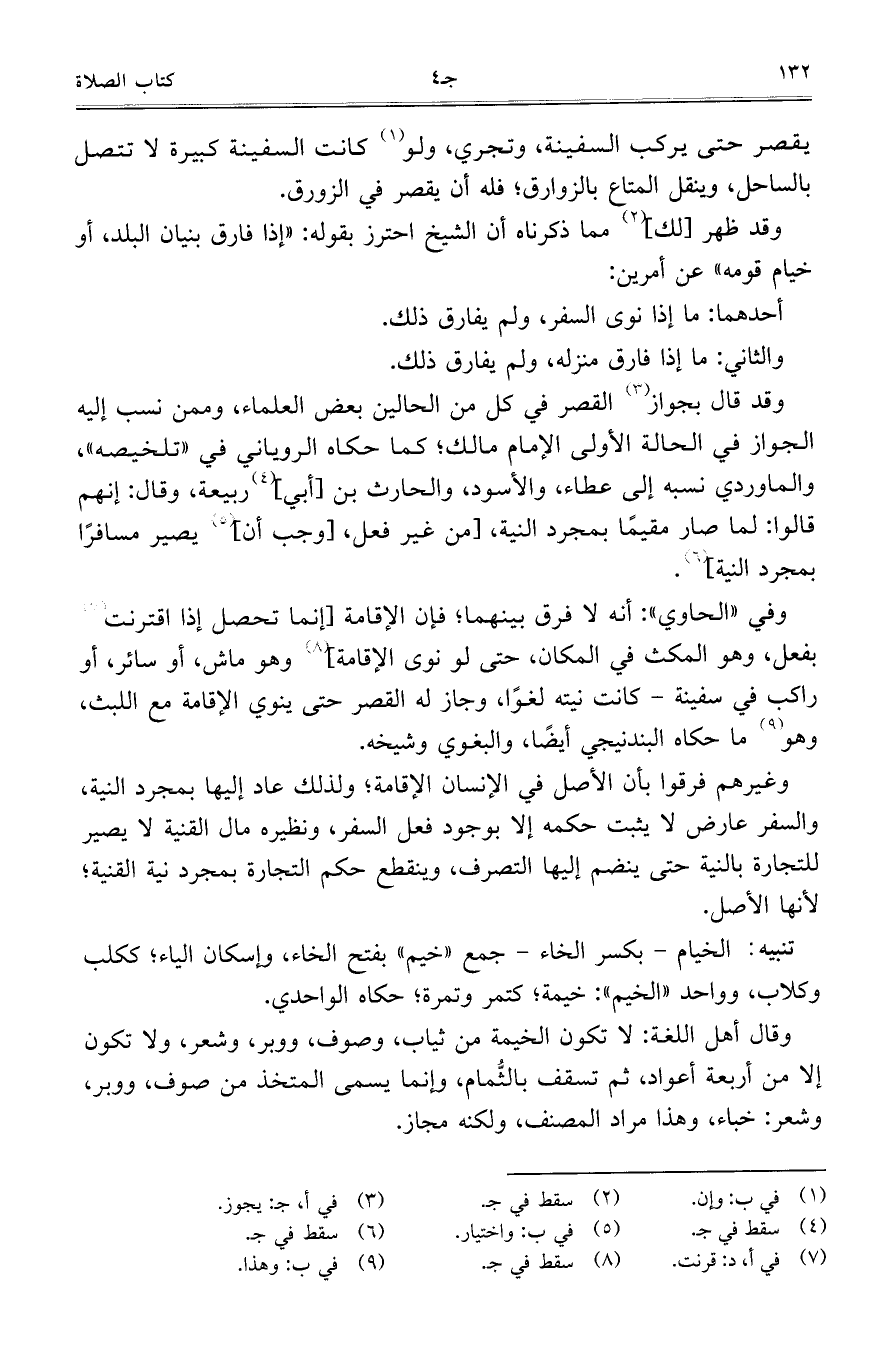 وغيرهم فرقوا بأن الأصل في الإنسان الإقامة؛ ولذلك عاد إليها بمجرد النية، والسفر عارض لا يثبت حكمه إلا بوجود فعل السفر، ونظيره مال القنية لا يصير للتجارة بالنية حتى ينضم إليها التصرف، وينقطع حكم التجارة بمجرد نية القنية؛ لأنها الأصل.