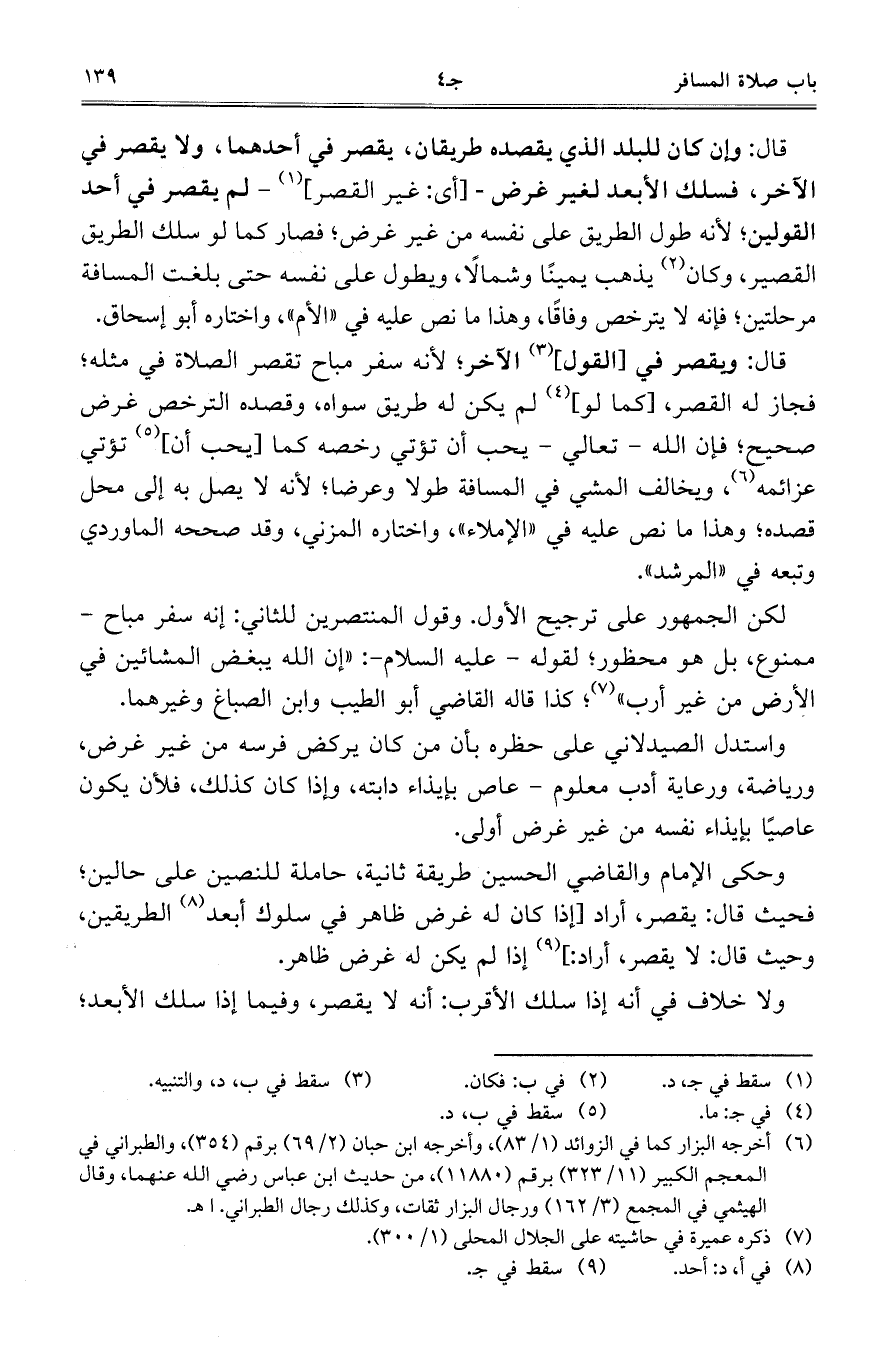 لكن الجمهور على ترجيح الأول. وقول المنتصرين للثاني: إنه سفر مباح- ممنوع، بل هو محظور؛ لقوله – عليه السلام-: "إن الله يبغض المشائين في الأرض من غير أرب"؛ كذا قاله القاضي أبو الطيب وابن الصباغ وغيرهما.