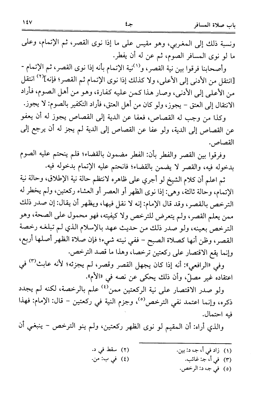 وأصحابنا فرقوا بين نية القصر، ونية الإتمام بأنه إذا نوى القصر، ثم الإتمام-[انتقل من الأدنى إلى الأعلى، ولا كذلك إذا نوى الإتمام ثم القصر؛ فإنه] انتقل من الأعلى إلى الأدنى، وصار هذا كمن عليه كفارة، وهو من أهل الصوم، فأراد الانتقال إلى العتق- يجوز، ولو كان من أهل العتق، فأراد التكفير بالصوم: لا يجوز.