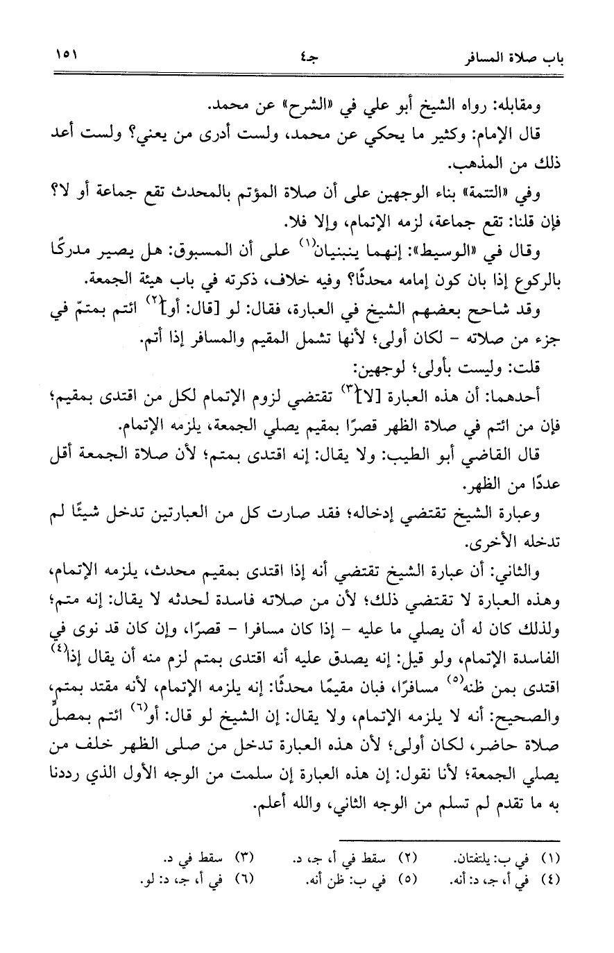 والثاني: أن عبارة الشيخ تقتضي أنه إذا اقتدى بمقيم محدث، يلزمه الإتمام، وهذه العبارة لا تقتضي ذلك؛ لأن من صلاته فاسدة لحدثه لا يقال: إنه متم؛ ولذلك كان له أن يصلي ما عليه- إذا كان مسافراً- قصراً، وإن كان قد نوى في الفاسدة الإتمام، ولو قيل: إنه يصدق عليه أنه اقتدى بمتم لزم منه أن يقال إذا اقتدى بمن ظنه مسافراً، فبان مقيماً محدثاً: إنه يلزمه الإتمام، لأنه مقتد بمتم، والصحيح: أنه لا يلزمه الإتمام، ولا يقال: إن الشيخ لو قال: أو ائتم بمصلِّ صلاة حاضر، لكان أولى؛ لأن هذه العبارة تدخل من صلى الظهر خلف من يصلي الجمعة؛ لأنا نقول: إن هذه العبارة إن سلمت من الوجه الأول الذي رددنا به ما تقدم لم تسلم من الوجه الثاني، والله أعلم.
