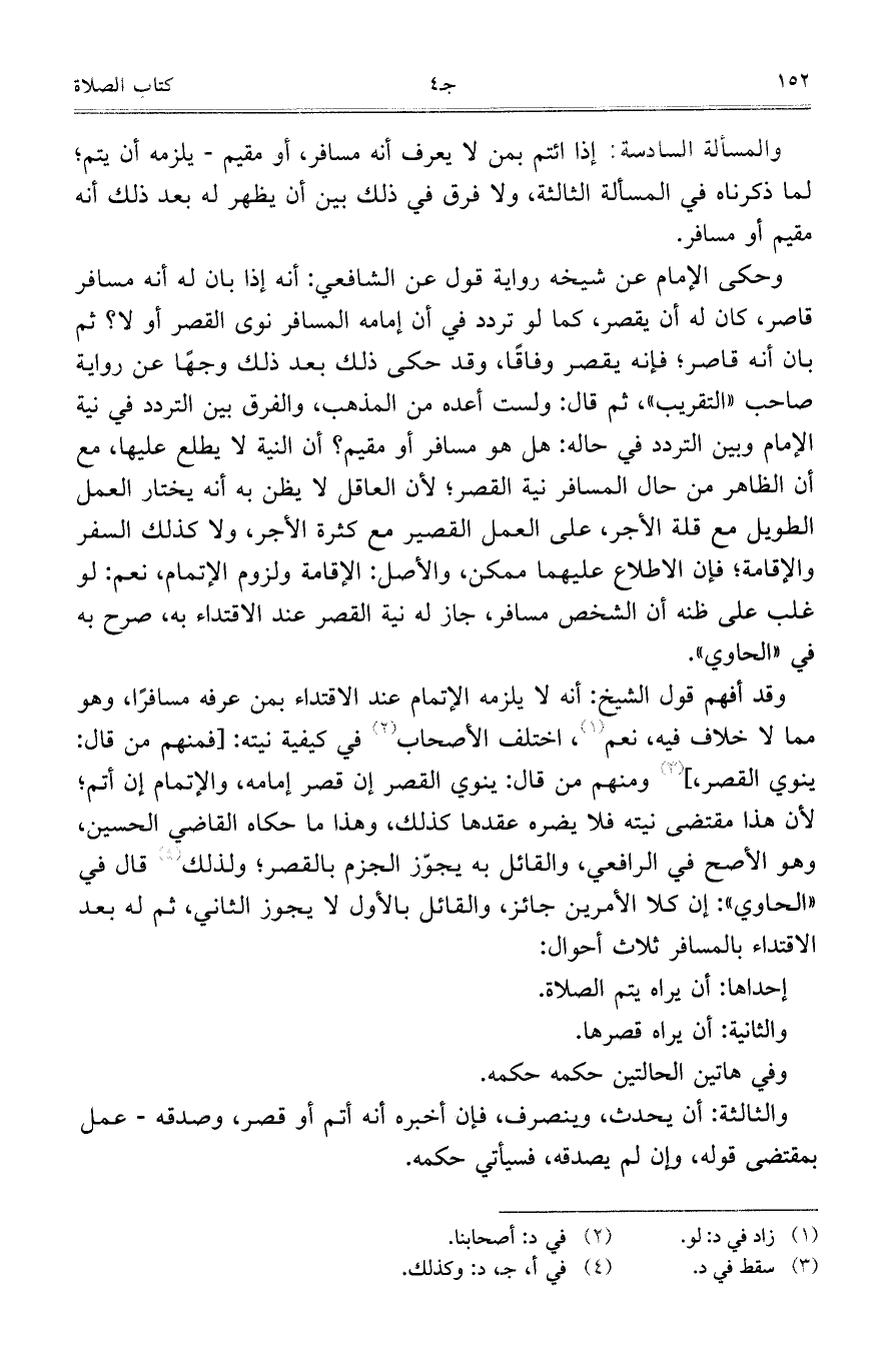 وقد أفهم قول الشيخ: أنه لا يلزمه الإتمام عند الاقتداء بمن عرفه مسافراً، وهو مما لا خلاف فيه، نعم، اختلف الأصحاب في كيفية نيته: [فمنهم من قال: ينوي القصر،] ومنهم من قال: ينوي القصر إن قصر إمامه، والإتمام إن أتم؛ لأن هذا مقتضى نيته فلا يضره عقدها كذلك، وهذا ما حكاه القاضي الحسين، وهو الأصح في الرافعي، والقائل به يجوّز الجزم بالقصر؛ ولذلك قال في "الحاوي": إن كلا الأمرين جائز، والقائل بالأول لا يجوز الثاني، ثم له بعد الاقتداء بالمسافر ثلاث أحوال: