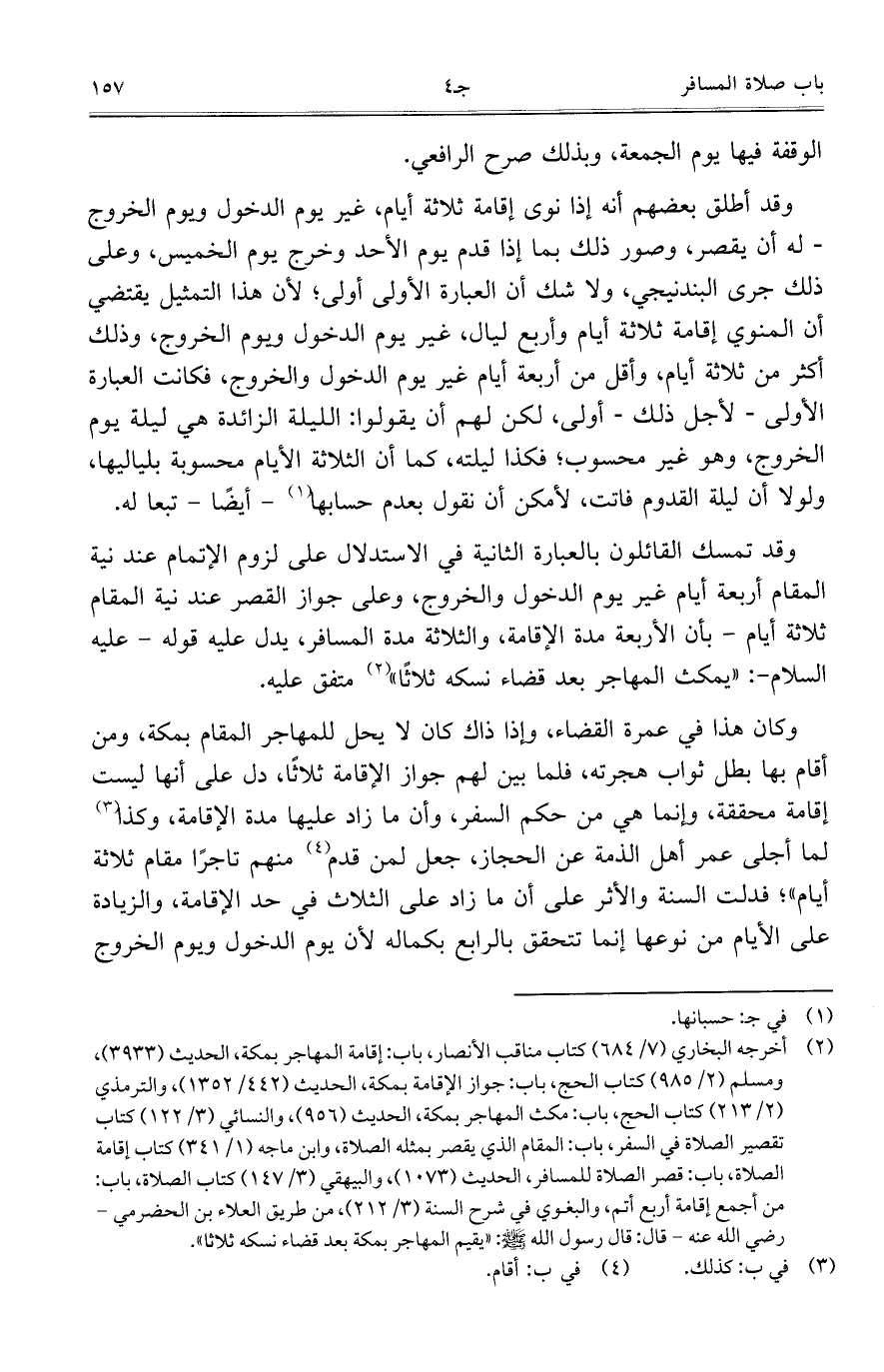 وقد تمسك القائلون بالعبارة الثانية في الاستدلال على لزوم الإتمام عند نية المقام أربعة أيام غير يوم الدخول والخروج، وعلى جواز القصر عند نية المقام ثلاثة أيام- بأن الأربعة مدة الإقامة، والثلاثة مدة المسافر، يدل عليه قوله- عليه السلام-: "يمكث المهاجر بعد قضاء نسكه ثلاثاً" متفق عليه.