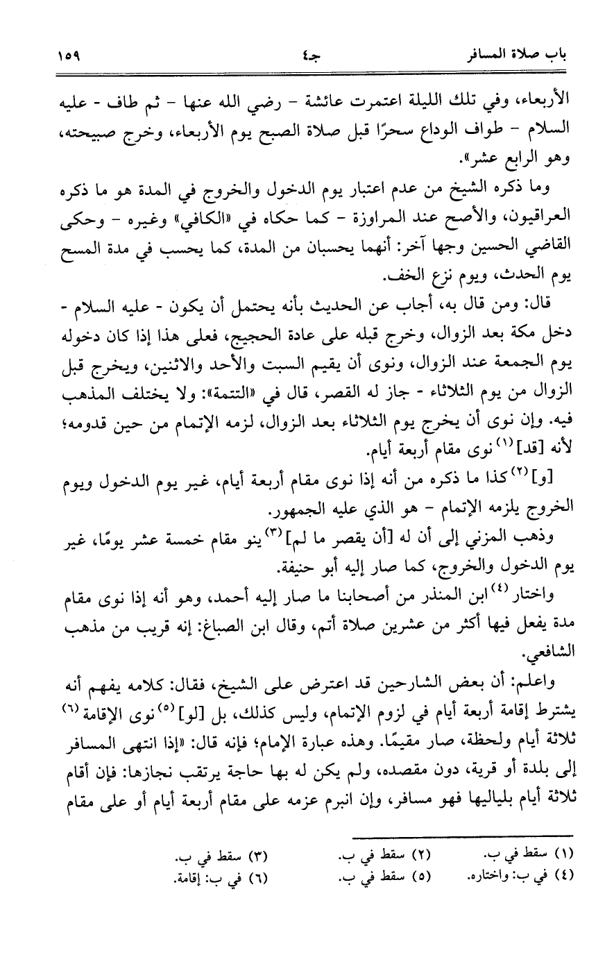 واعلم: أن بعض الشارحين قد اعترض على الشيخ، فقال: كلامه يفهم أنه يشترط إقامة أربعة أيام في لزوم الإتمام، وليس كذلك، بل [لو] نوى الإقامة ثلاثة أيام ولحظة، صار مقيماً. وهذه عبارة الإمام؛ فإنه قال: "إذا انتهى المسافر إلى بلدة أو قرية، دون مقصده، ولم يكن له بها حاجة يرتقب نجازها: فإن أقام ثلاثة أيام بلياليها فهو مسافر، وإن انبرم عزمه على مقام أربعة أيام أو على مقام