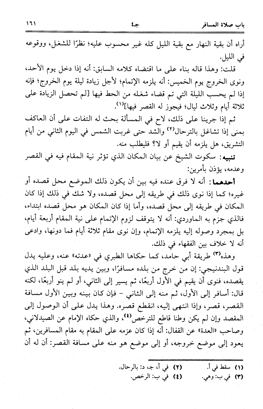 تنبيه: سكوت الشيخ عن بيان المكان الذي تؤثر نية المقام فيه في القصر وعدمه، يؤذن بأمرين: