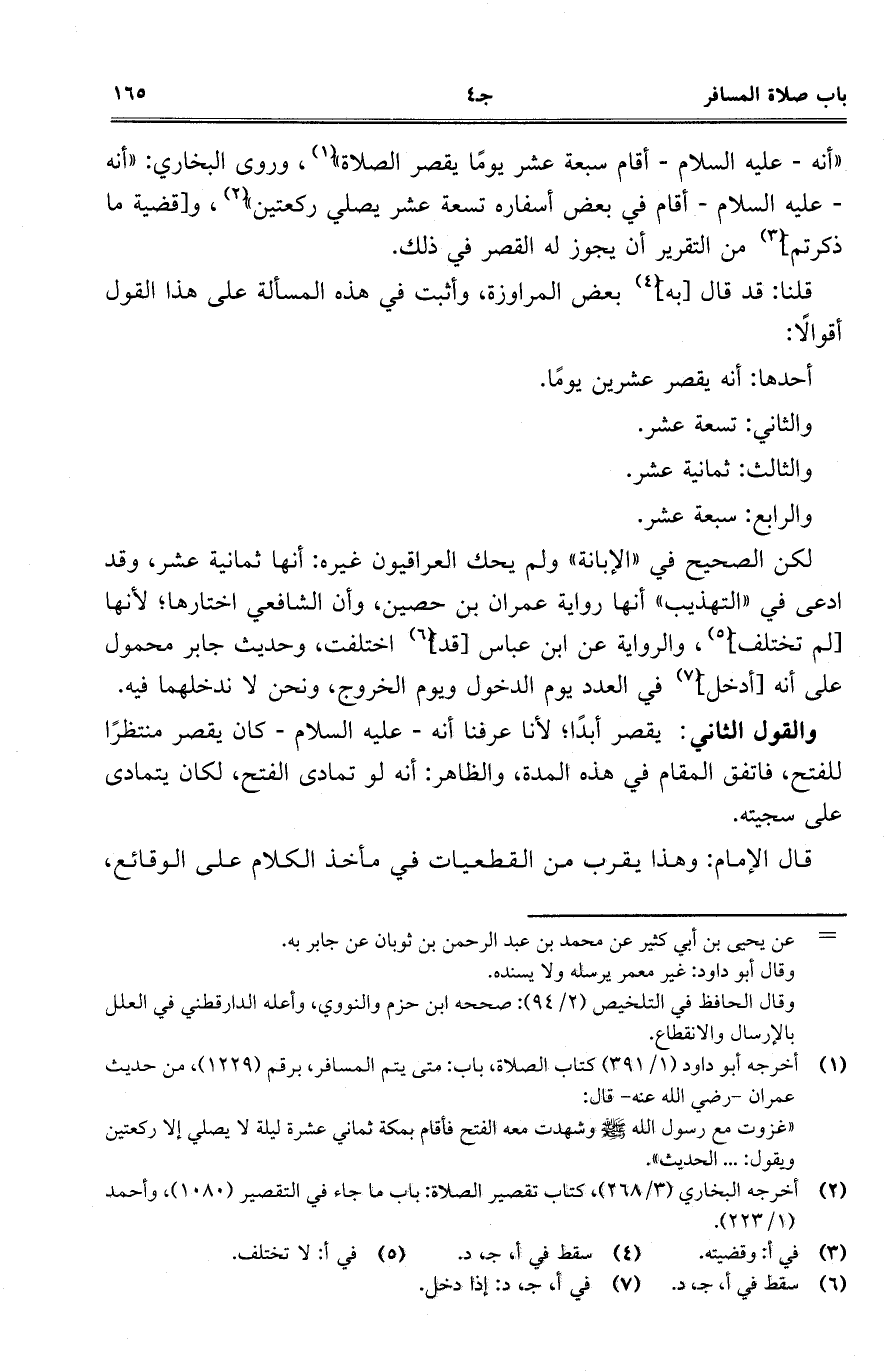 "أنه- عليه السلام- أقام سبعة عشر يوماً يقصر الصلاة"، وروى البخاري: "أنه- عليه السلام- أقام في بعض أسفاره تسعة عشر يصلي ركعتين"، و [قضية ما ذكرتم] من التقرير أن يجوز له القصر في ذلك.