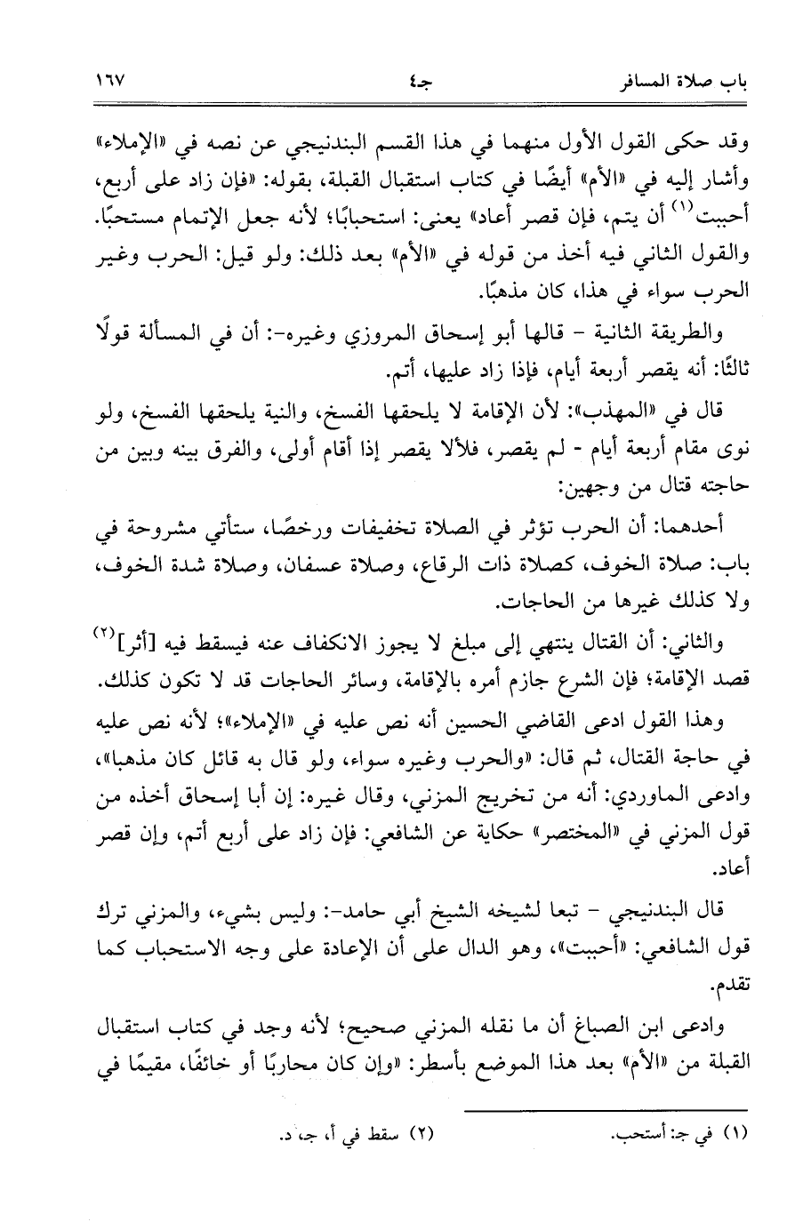 وقد حكى القول الأول منهما في هذا القسم البندنيجي عن نصه في "الإملاء" وأشار إليه في "الأم" أيضاً في كتاب استقبال القبلة، بقوله: "فإن زاد على أربع، أحببت أن يتم، فإن قصر أعاد" يعني: استحباباً؛ لأنه جعل الإتمام مستحباً. والقول الثاني فيه أخذ من قوله في "الأم" بعد ذلك: ولو قيل: الحرب وغير الحرب سواء في هذا، كان مذهباً.