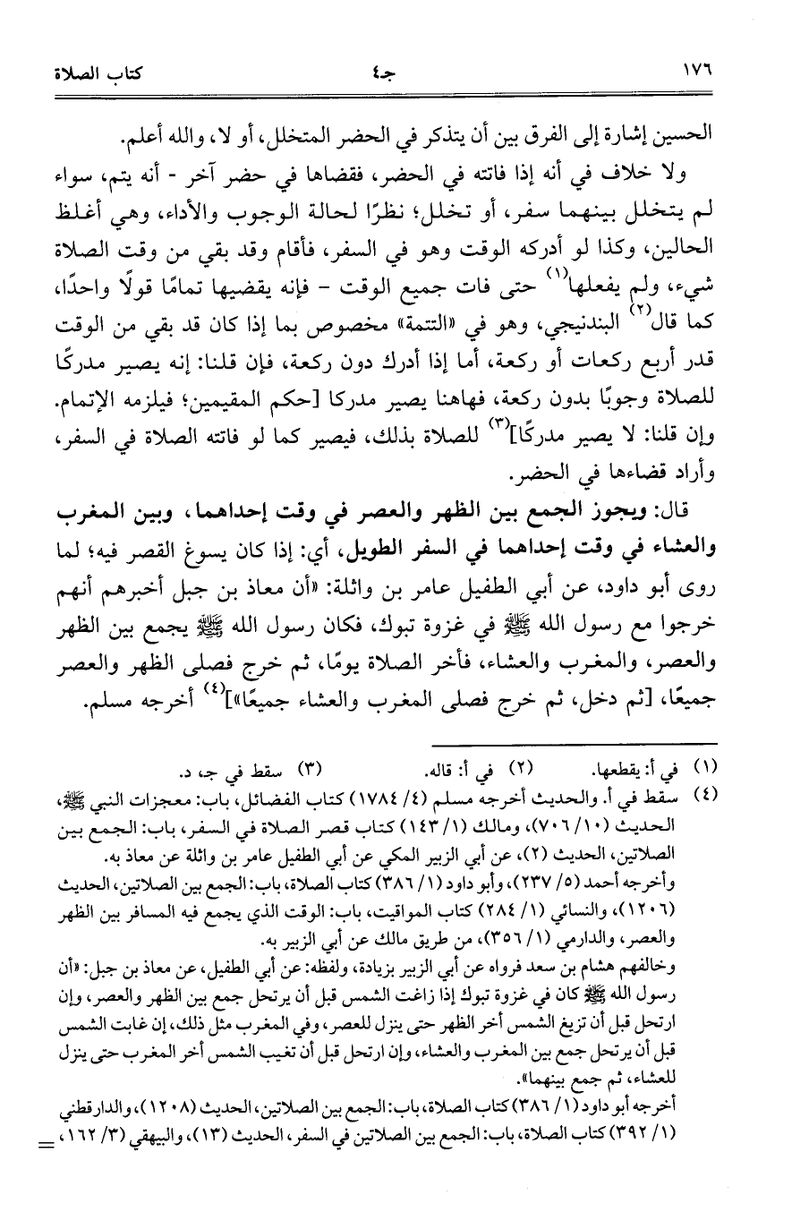 قال: ويجوز الجمع بين الظهر والعصر في وقت إحداهما، وبين المغرب والعشاء في وقت إحداهما في السفر الطويل، أي: إذا كان يسوغ القصر فيه؛ لما روى أبو داود، عن أبي الطفيل عامر بن واثلة: "أن معاذ بن جبل أخبرهم أنهم خرجوا مع رسول الله صلى الله عليه وسلم في غزوة تبوك، فكان رسول الله صلى الله عليه وسلم يجمع بين الظهر والعصر، والمغرب والعشاء، فأخر الصلاة يوماً، ثم خرج فصلى الظهر والعصر جميعاً، [ثم دخل، ثم خرج فصلى المغرب والعشاء جميعاً"] أخرجه مسلم.