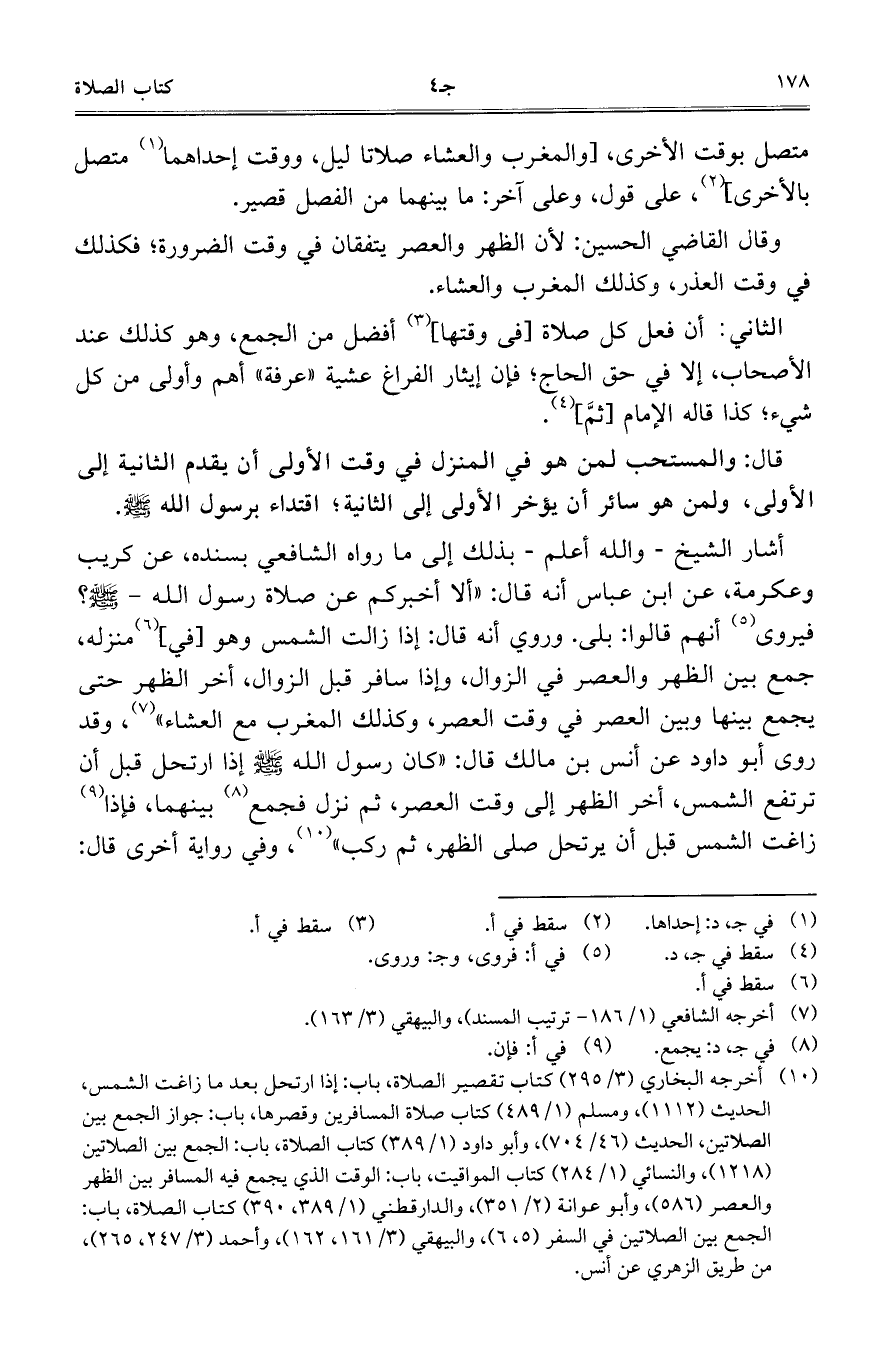 قال: والمستحب لمن هو في المنزل في وقت الأولى أن يقدم الثانية إلى الأولى، ولمن هو سائر أن يؤخر الأولى إلى الثانية؛ اقتداء برسول الله صلى الله عليه وسلم.