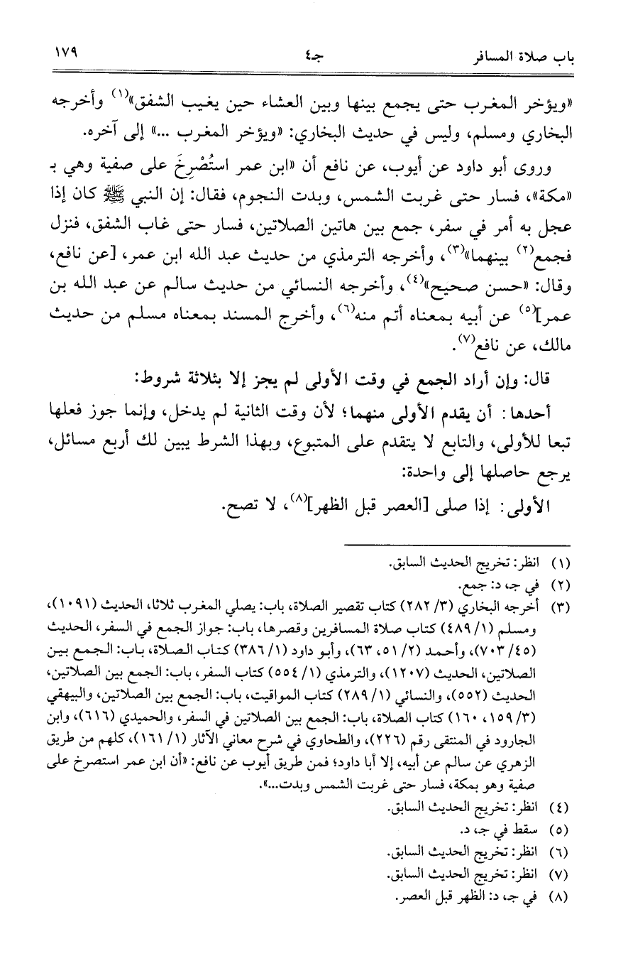 وروى أبو داود عن أيوب، عن نافع أن "ابن عمر استُصْرِخَ على صفية وهي بـ "مكة"، فسار حتى غربت الشمس، وبدت النجوم، فقال: إن النبي صلى الله عليه وسلم كان إذا عجل به أمر في سفر، جمع بين هاتين الصلاتين، فسار حتى غاب الشفق، فنزل فجمع بينهما"، وأخرجه الترمذي من حديث عبد الله ابن عمر، [عن نافع، وقال: "حسن صحيح"، وأخرجه النسائي من حديث سالم عن عبد الله بن عمر] عن أبيه بمعناه أتم منه، وأخرج المسند بمعناه مسلم من حديث مالك، عن نافع.