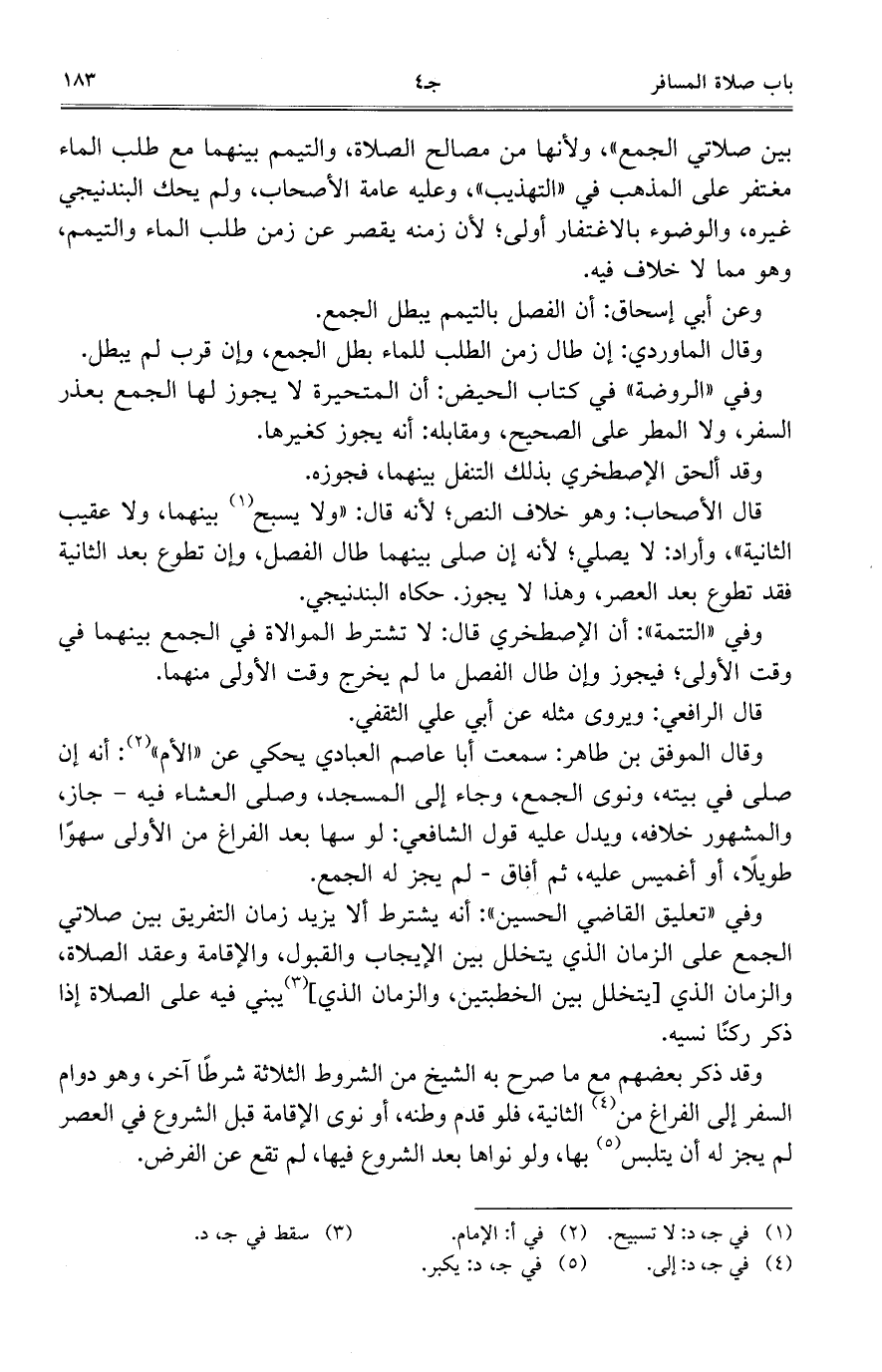 وقد ذكر بعضهم مع ما صرح به الشيخ من الشروط الثلاثة شرطاً آخر، وهو دوام السفر إلى الفراغ من الثانية، فلو قدم وطنه، أو نوى الإقامة قبل الشروع في العصر لم يجز له أن يتلبس بها، ولو نواها بعد الشروع فيها، لم تقع عن الفرض.