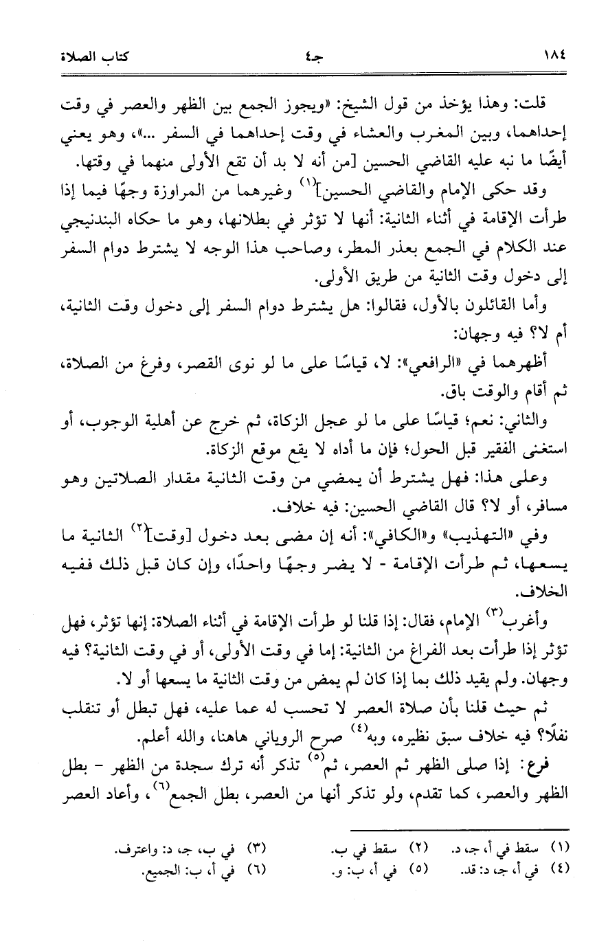 قلت: وهذا يؤخذ من قول الشيخ: "ويجوز الجمع بين الظهر والعصر في وقت إحداهما، وبين المغرب والعشاء في وقت إحداهما في السفر .. "، وهو يعني أيضاً ما نبه عليه القاضي الحسين [من أنه لابد أن تقع الأولى منهما في وقتها.