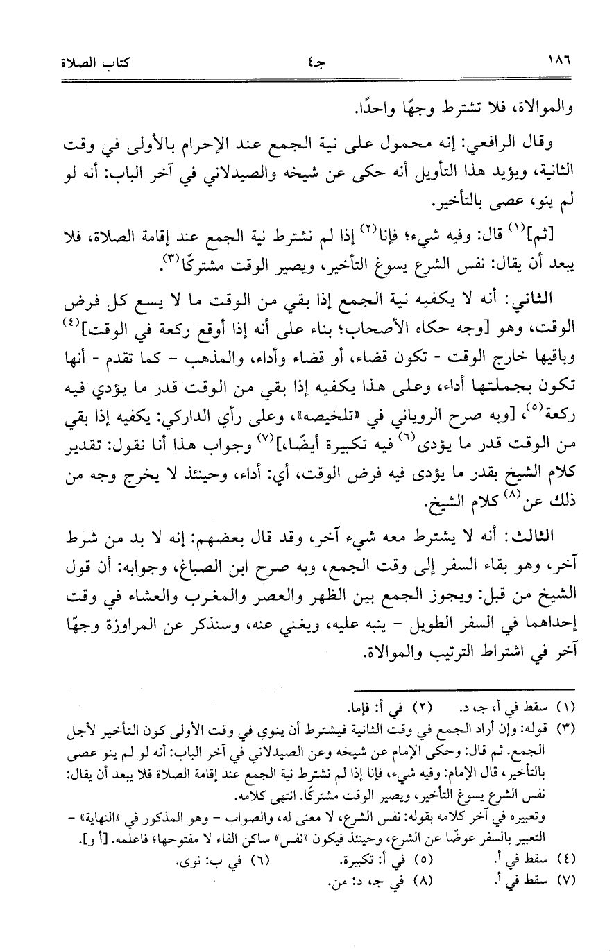 الثالث: أنه لا يشترط معه شيء آخر، وقد قال بعضهم: إنه لابد من شرط آخر، وهو بقاء السفر إلى وقت الجمع، وبه صرح ابن الصباغ، وجوابه: أن قول الشيخ من قبل: ويجوز الجمع بين الظهر والعصر والمغرب والعشاء في وقت إحداهما في السفر الطويل- ينبه عليه، ويغني عنه، وسنذكر عن المراوزة وجهاً آخر في اشتراط الترتيب والموالاة.