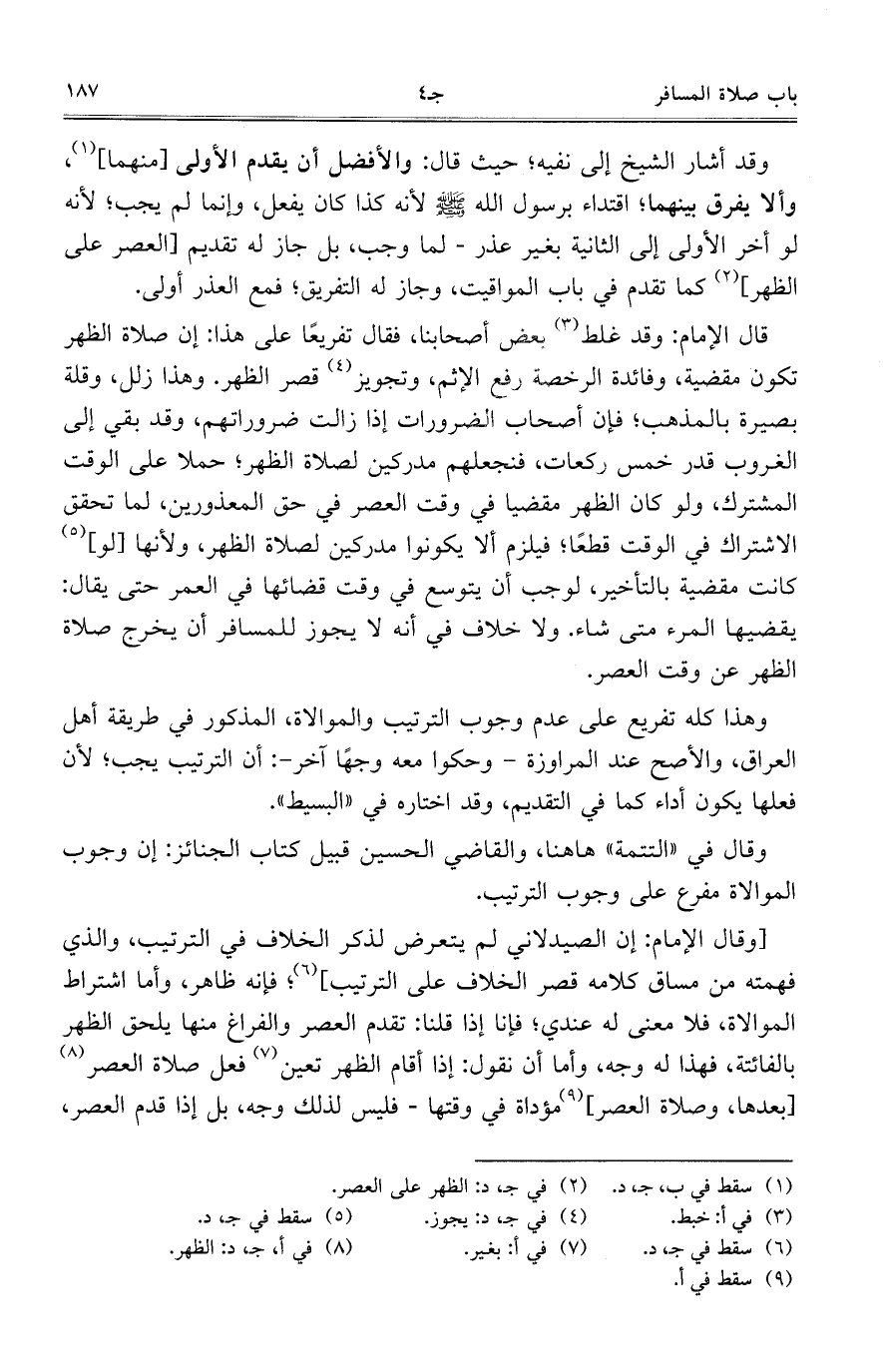 [وقال الإمام: إن الصيدلاني لم يتعرض لذكر الخلاف في الترتيب، والذي فهمته من مساق كلامه قصر الخلاف على الترتيب]؛ فإنه ظاهر، وأما اشتراط الموالاة، فلا معنى له عندي؛ فإنا إذا قلنا: تقدم العصر والفراغ منها يلحق الظهر بالفائتة، فهذا له وجه، وأما أن نقول: إذا أقام الظهر تعين فعل صلاة الظهر [بعدها] وصلاة العصر] مؤداة في وقتها- فليس لذلك وجه، بل إذا قدم العصر،