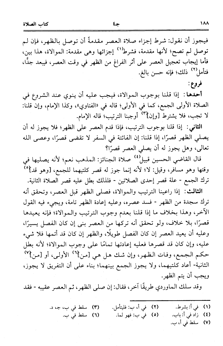 فيجوز أن نقول: شرط إجزاء صلاة العصر مقدمةً أن توصل بالظهر، فإن لم توصل لم تصح؛ لأنها مقدمة، فشرط إجزائها وهي مقدمة: الموالاة، هذا بين، فأما إيجاب تعجيل العصر على أثر الفراغ من الظهر في وقت العصر، فيبعد جدّاً، فتأمل ذلك؛ فإنه حسن بالغ.
