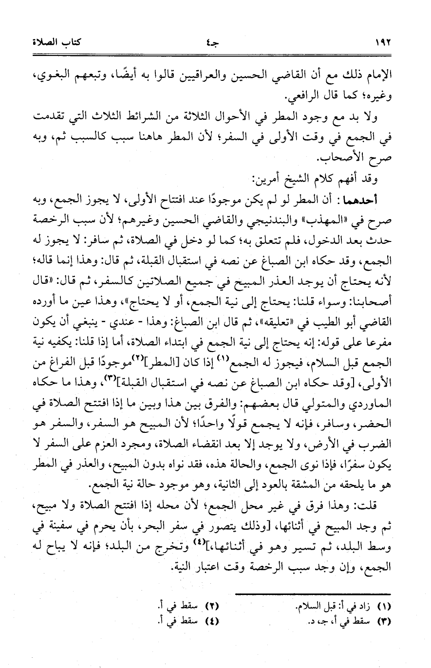 ولابد مع وجود المطر في الأحوال الثلاثة من الشرائط الثلاث التي تقدمت في الجمع في وقت الأولى في السفر؛ لأن المطر هاهنا سبب كالسبب ثم، وبه صرح الأصحاب.