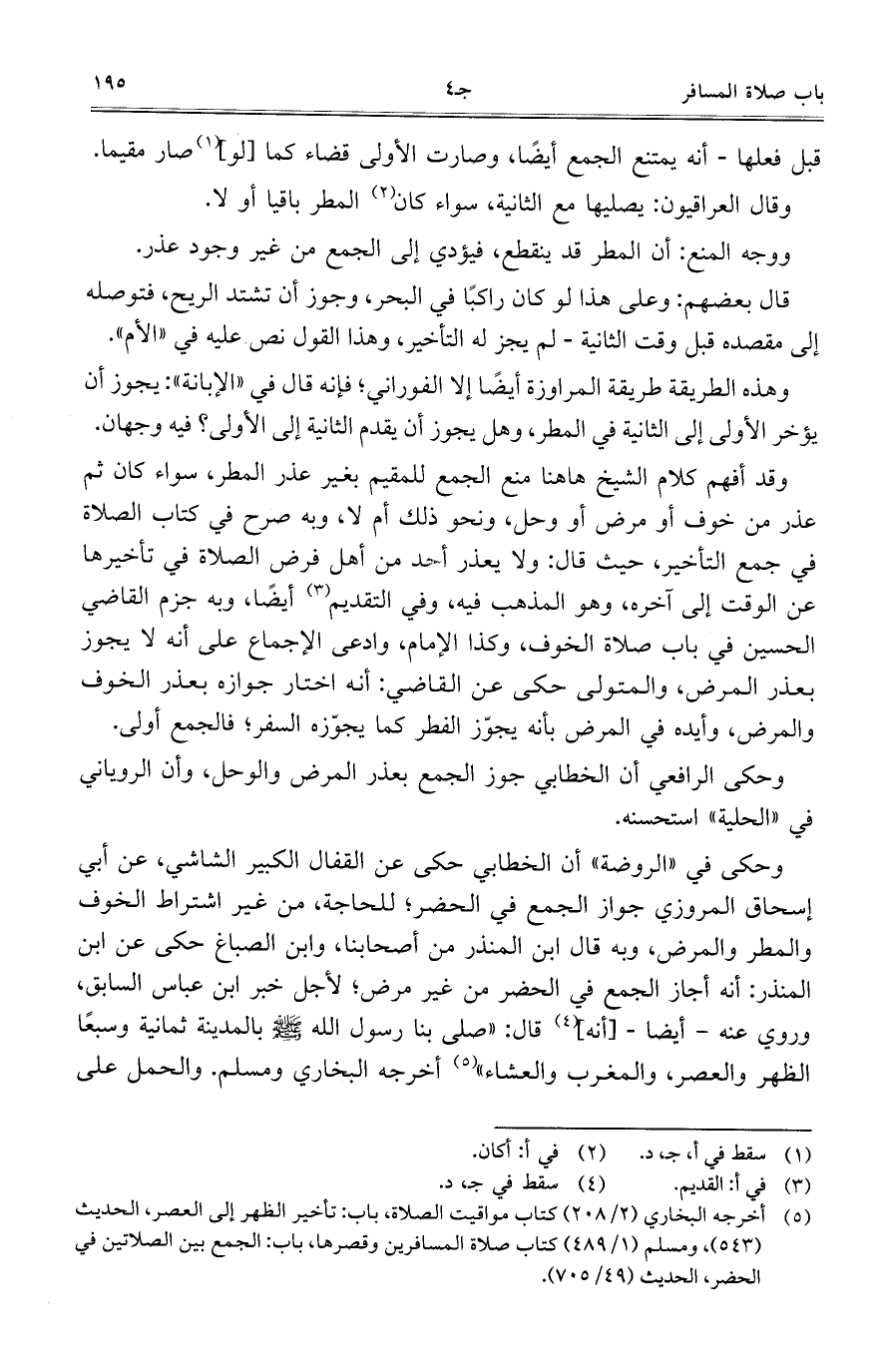 وحكى في "الروضة" أن الخطابي حكى عن القفال الكبير الشاشي، عن أبي إسحاق المروزي جواز الجمع في الحضر؛ للحاجة، من غير اشتراط الخوف والمطر والمرض، وبه قال ابن المنذر من أصحابنا، وابن الصباغ حكى عن ابن المنذر: أنه أجاز الجمع في الحضر من غير مرض؛ لأجل خبر ابن عباس السابق، وروي عنه- أيضاً-[أنه] قال: "صلى بنا رسول الله صلى الله عليه وسلم بالمدينة ثمانية وسبعاً الظهر والعصر، والمغرب والعشاء" أخرجه البخاري ومسلم. والحمل على