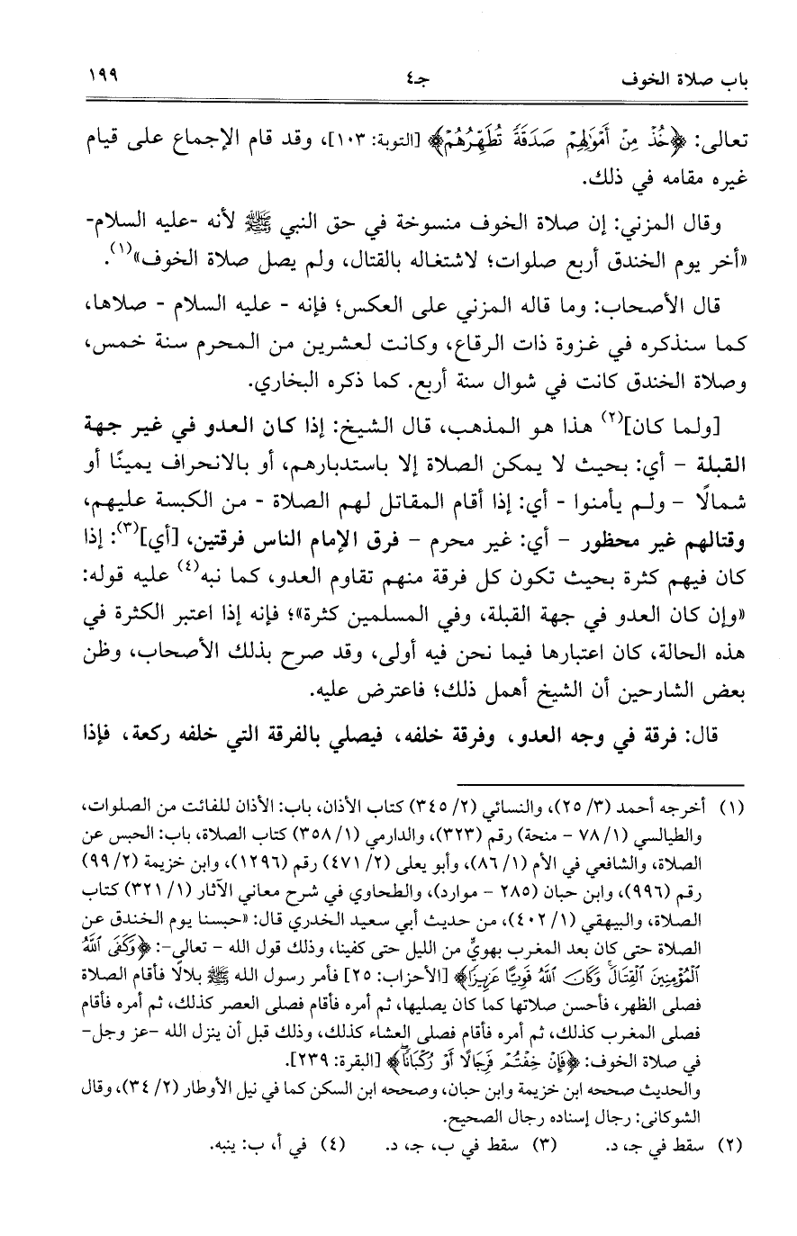 قال الأصحاب: وما قاله المزني على العكس؛ فإنه- عليه السلام- صلاها، كما سنذكره في غزوة ذات الرقاع، وكانت لعشرين من المحرم سنة خمس، وصلاة الخندق كانت في شوال سنة اربع. كما ذكره البخاري.