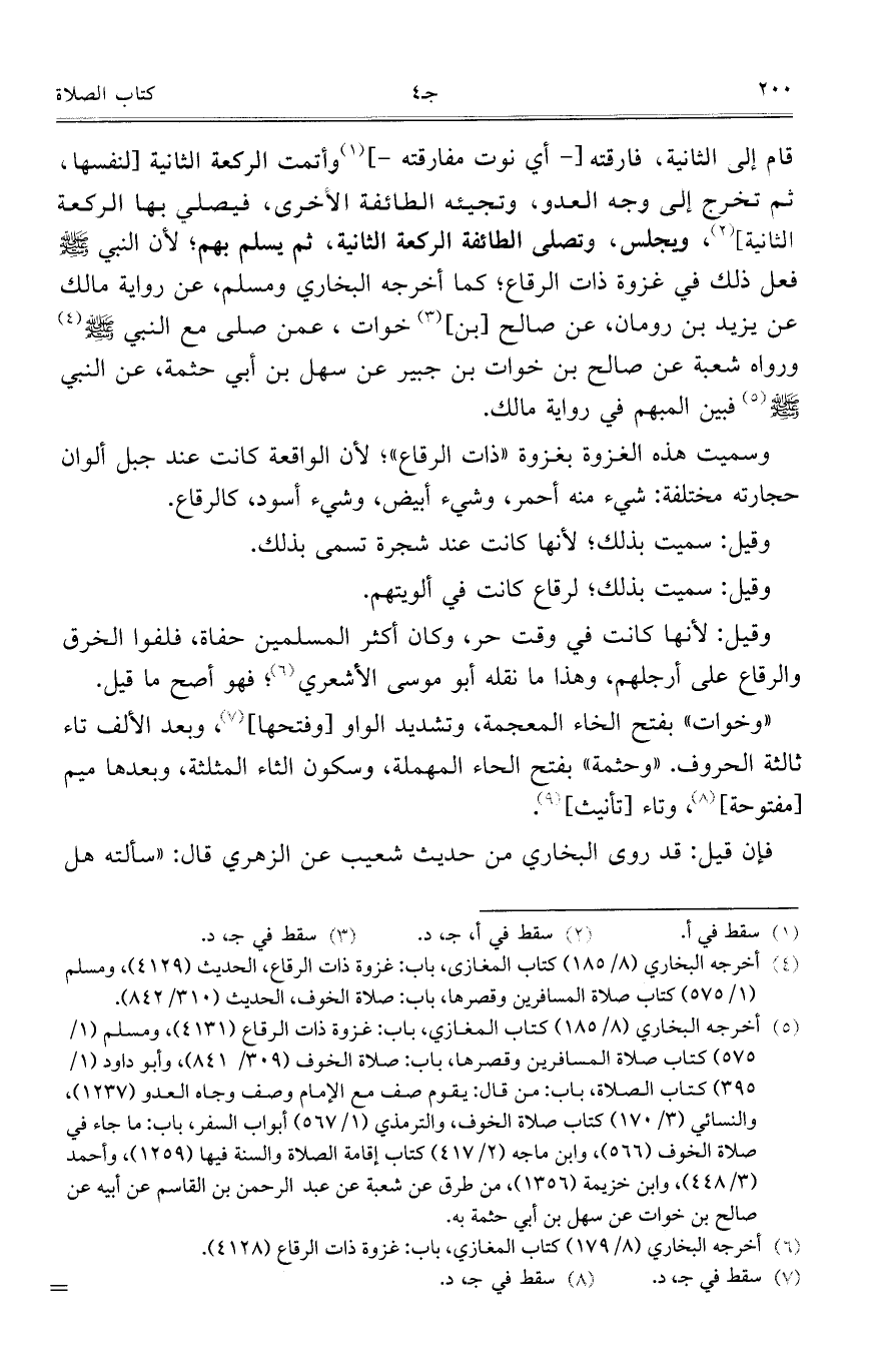 قام إلى الثانية، فارقته [- أي نوت مفارقته-] وأتمت الركعة الثانية [لنفسها، ثم تخرج إلى وجه العدو، وتجيئه الطائفة الأخرى، فيصلي بها الركعة الثانية]، ويجلس، وتصلي الطائفة الركعة الثانية، ثم يسلم بهم؛ لأن النبي صلى الله عليه وسلم فعل ذلك في غزوة ذات الرقاع؛ كما أخرجه البخاري ومسلم، عن رواية مالك عن يزيد بن رومان، عن صالح [بن] خوات، عمن صلى مع النبي صلى الله عليه وسلم ورواه شعبة عن صالح بن خوات بن جبير عن سهل بن أبي حثمة، عن النبي صلى الله عليه وسلم فبين المبهم في رواية مالك.