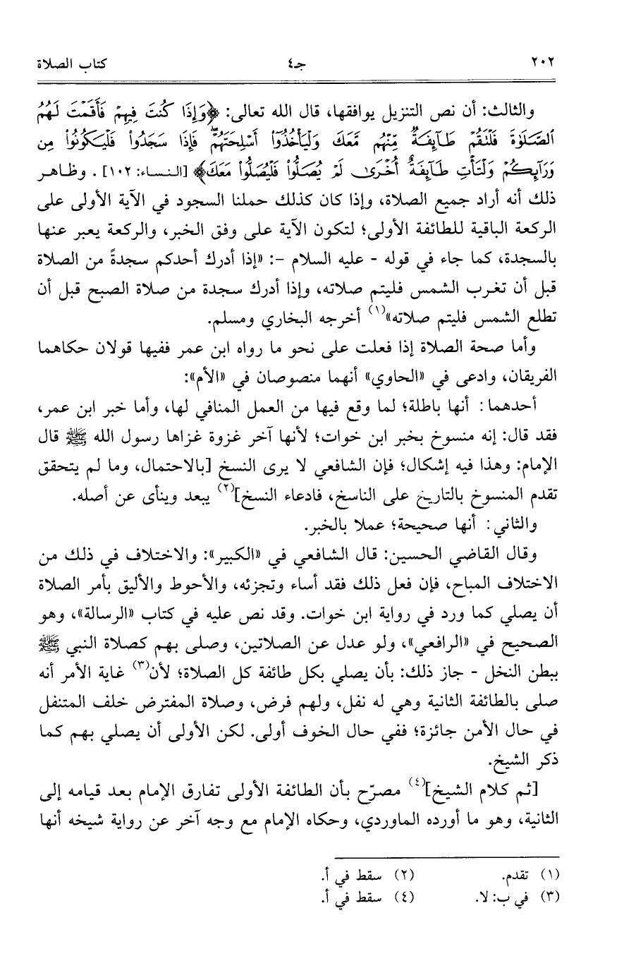 والثالث: أن نص التنزيل يوافقها، قال الله تعالى: {وَإِذَا كُنتَ فِيهِمْ فَأَقَمْتَ لَهُمْ الصَّلاةَ فَلْتَقُمْ طَائِفَةٌ مِنْهُمْ مَعَكَ وَلْيَاخُذُوا أَسْلِحَتَهُمْ فَإِذَا سَجَدُوا فَلْيَكُونُوا مِنْ وَرَائِكُمْ وَلْتَاتِ طَائِفَةٌ أُخْرَى لَمْ يُصَلُّوا فَلْيُصَلُّوا مَعَكَ} [النساء: 102]. وظاهر ذلك أنه أراد جميع الصلاة، وإذا كان كذلك حملنا السجود في الآية الأولى على الركعة الباقية للطائفة الأولى؛ لتكون الآية على وفق الخبر، والركعة يعبر عنها بالسجدة، كما جاء في قوله - عليه السلام-: "إذا أدرك أحدكم سجدةً من الصلاة قبل أن تغرب الشمس فليتم صلاته، وإذا أدرك سجدة من صلاة الصبح قبل أن تطلع الشمس فليتم صلاته" أخرجه البخاري ومسلم.