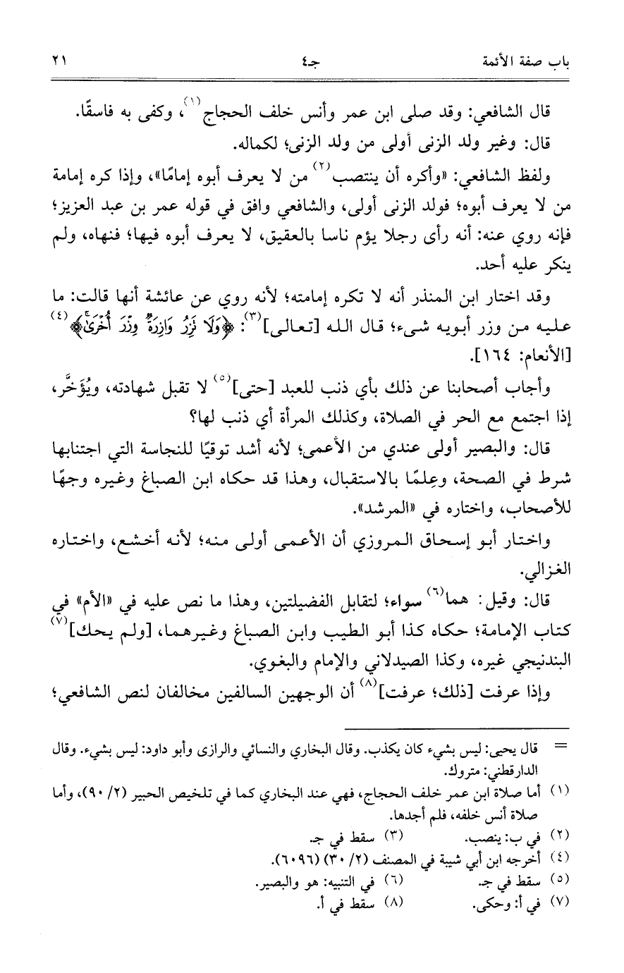 وقد اختار ابن المنذر أنه لا تكره إمامته؛ لأنه روي عن عائشة أنها قالت؛ ما عليه من وزر أبويه شيء؛ قال الله [تعالى]: {وَلاَ تَزِرُ وَازِرَةٌ وِزْرَ أُخْرَى} [الأنعام: 164].