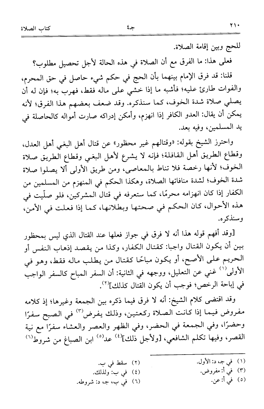 [وقد أفهم قوله هذا أنه لا فرق في جواز فعلها عند القتال الذي ليس بمحظور بين أن يكون القتال واجباً: كقتال الكفار، وكذا من يقصد إذهاب النفس أو الحريم على الأصح، أو يكون مباحاً كقتال من يطلب ماله فقط، وهو في الأولى غني عن التعليل، ووجهه في الثانية: أن السفر المباح كالسفر الواجب في إباحة الرخص؛ فوجب أن يكون القتال كذلك].