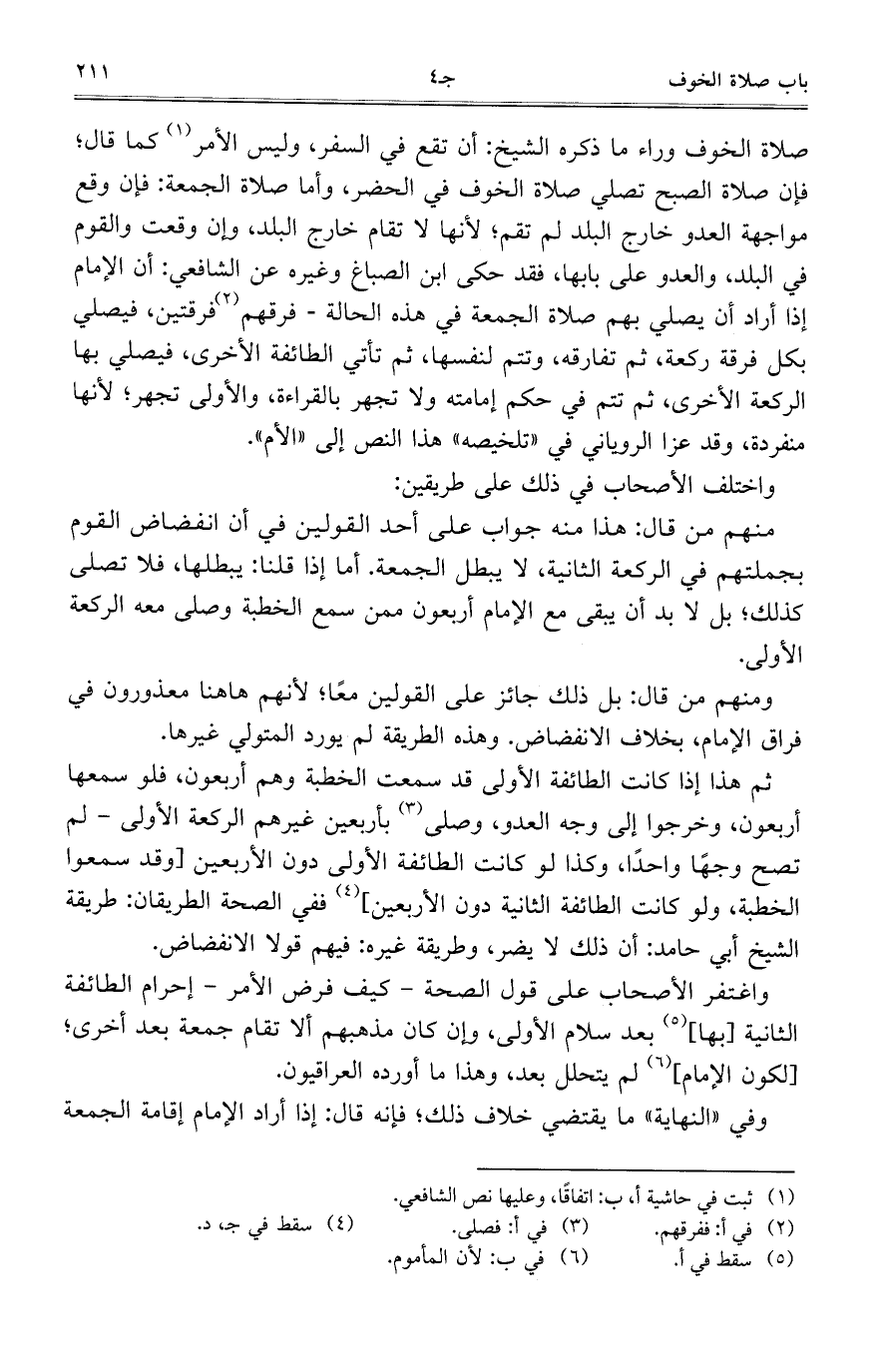 صلاة الخوف وراء ما ذكره الشيخ: أن تقع في السفر، وليس الأمر كما قال؛ فإن صلاة الصبح تصلي صلاة الخوف في الحضر، وأما صلاة الجمعة: فإن وقع مواجهة العدو خارج البلد لم تقم؛ لأنها لا تقام خارج البلد، وإن وقعت والقوم في البلد، والعدو على بابها، فقد حكى ابن الصباغ وغيره عن الشافعي: أن الإمام إذا أراد أن يصلي بهم صلاة الجمعة في هذه الحالة- فرقهم فرقتين، فيصلي بكل فرقة ركعة، ثم تفارقه، وتتم لنفسها، ثم تأتي الطائسفة الأخرى، فيصلي بها الركعة الأخرى، ثم تتم في حكم إمامته ولا تجهر بالقراءة، والأولى تجهر؛ لأنها منفردة، وقد عزا الروياني في "تلخيصه" هذا النص إلى "الأم".