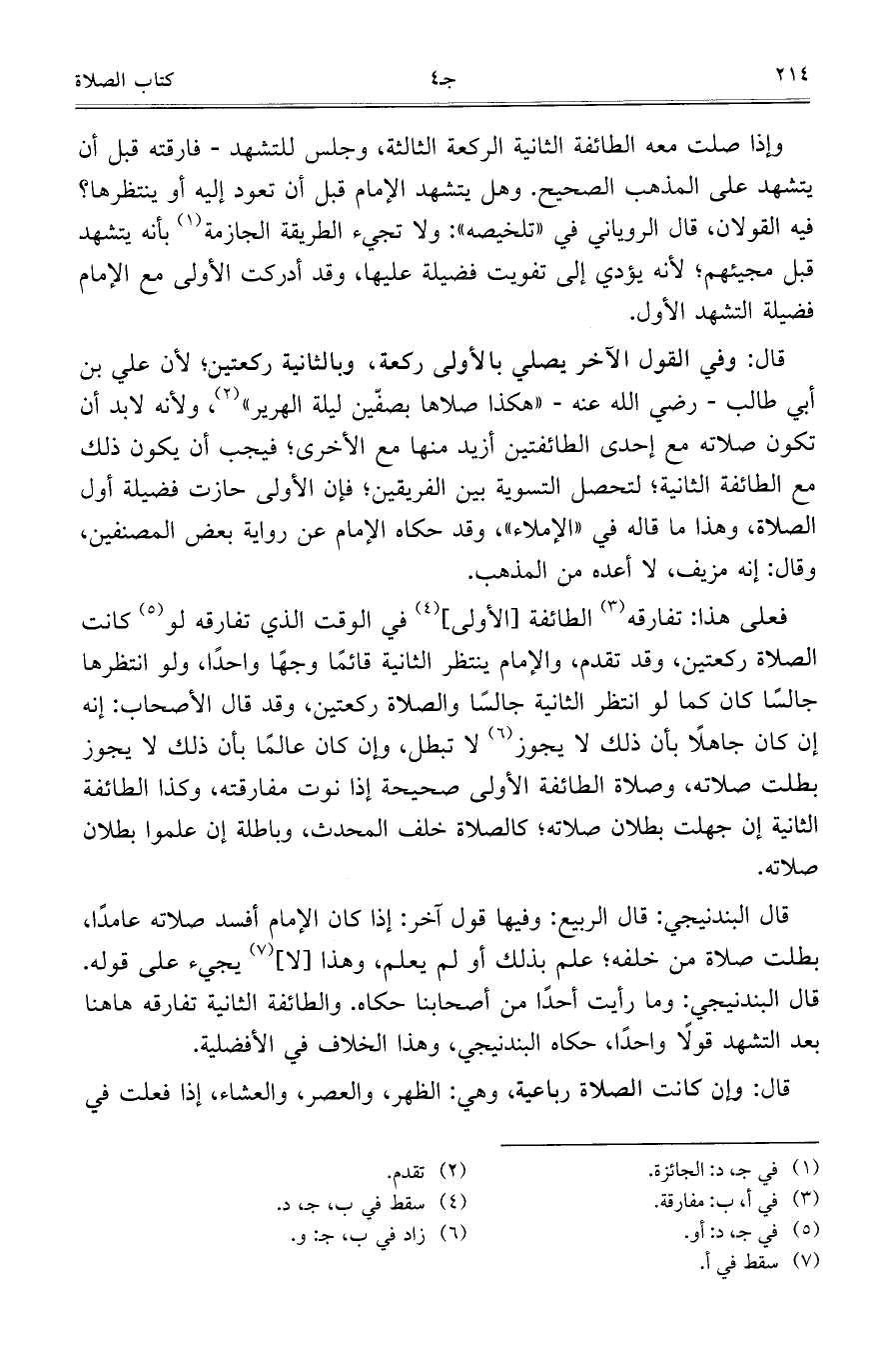 وإذا صلت معه الطائفة الثانية الركعة الثالثة، وجلس للتشهد- فارقته قبل أن يتشهد على المذهب الصحيح. وهل يتشهد الإمام قبل أن تعود إليه أو ينتظرها؟ فيه القولان، قال الروياني في "تلخيصه": ولا تجيء الطريقة الجازمة بأنه يتشهد قبل مجيئهم؛ لأنه يؤدي إلى تفويت فضيلة عليها، وقد أدركت الأولى مع الإمام فضيلة التشهد الأول.