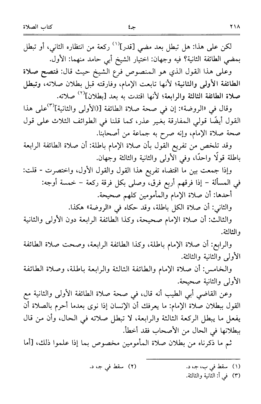 وقد تلخص من تفريع القول بأن صلاة الإمام باطلة: أن صلاة الطائفة الرابعة باطلة قولاً واحداً، وفي الأولى والثانية والثالثة وجهان.