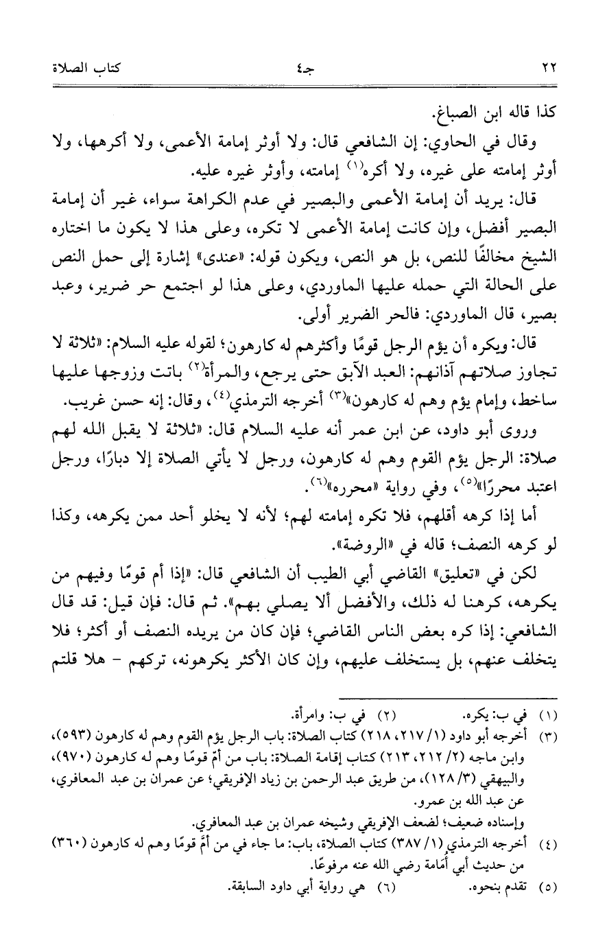 وروى أبو داود، عن ابن عمر أنه عليه السلام قال: "ثلاثة لا يقبل الله لهم صلاة: الرجل يؤم القوم وهم له كارهون، ورجل لا يأتي الصلاة إلا دباراً، ورجل اعتبد محرراً"، وفي رواية "محرره".