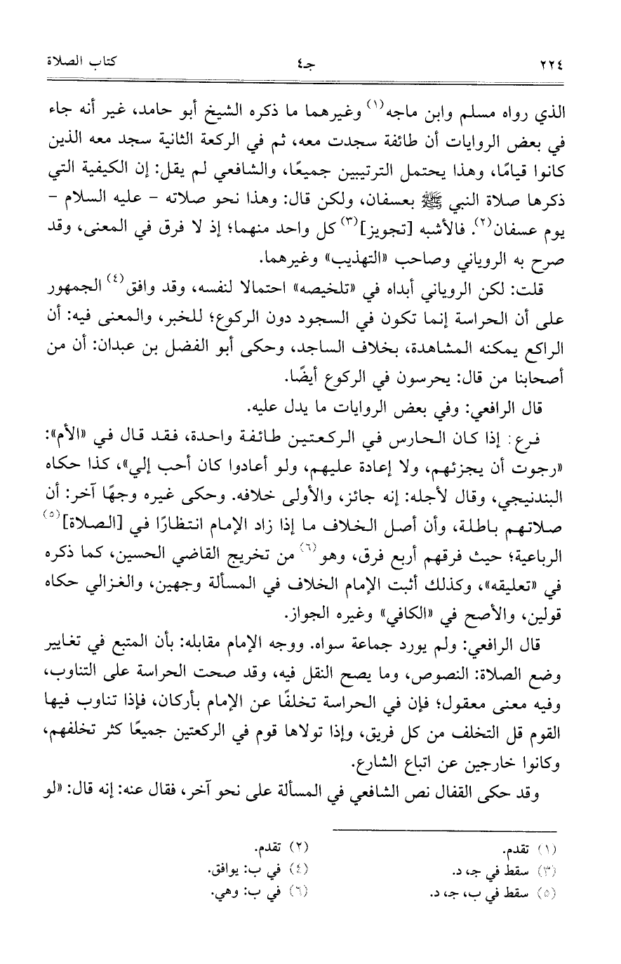 قلت: لكن الروياني أبداه في "تلخيصه" احتمالاً لنفسه، وقد وافق الجمهور على أن الحراسة إنما تكون في السجود دون الركوع؛ للخبر، والمعنى فيه: أن الراكع يمكنه المشاهدة، بخلاف الساجد، وحكى أبو الفضل بن عبدان: أن من أصحابنا من قال: يحرسون في الركوع أيضاً.