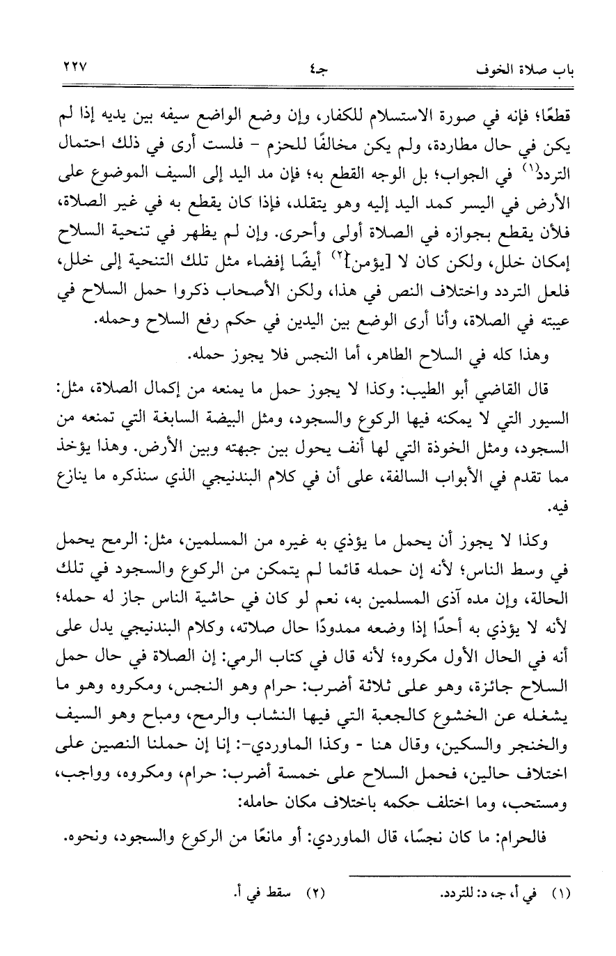 وهذا كله في السلاح الطاهر، أما النجس فلا يجوز حمله.