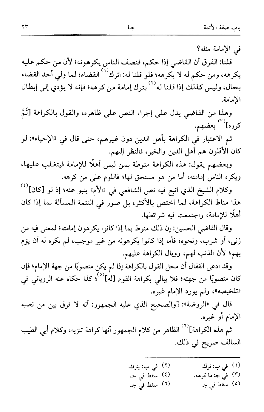 قلنا: الفرق أن القاضي إذا حكم، فنصف الناس يكرهونه؛ لأن من حكم عليه يكرهه، ومن حكم له لا يكرهه؛ فلو قلنا له: اترك القضاء؛ لما ولي أحد القضاء بحال، وليس كذلك إذا قلنا له بترك إمامة من كرهه؛ فإنه لا يؤدي إلى إبطال الإمامة.