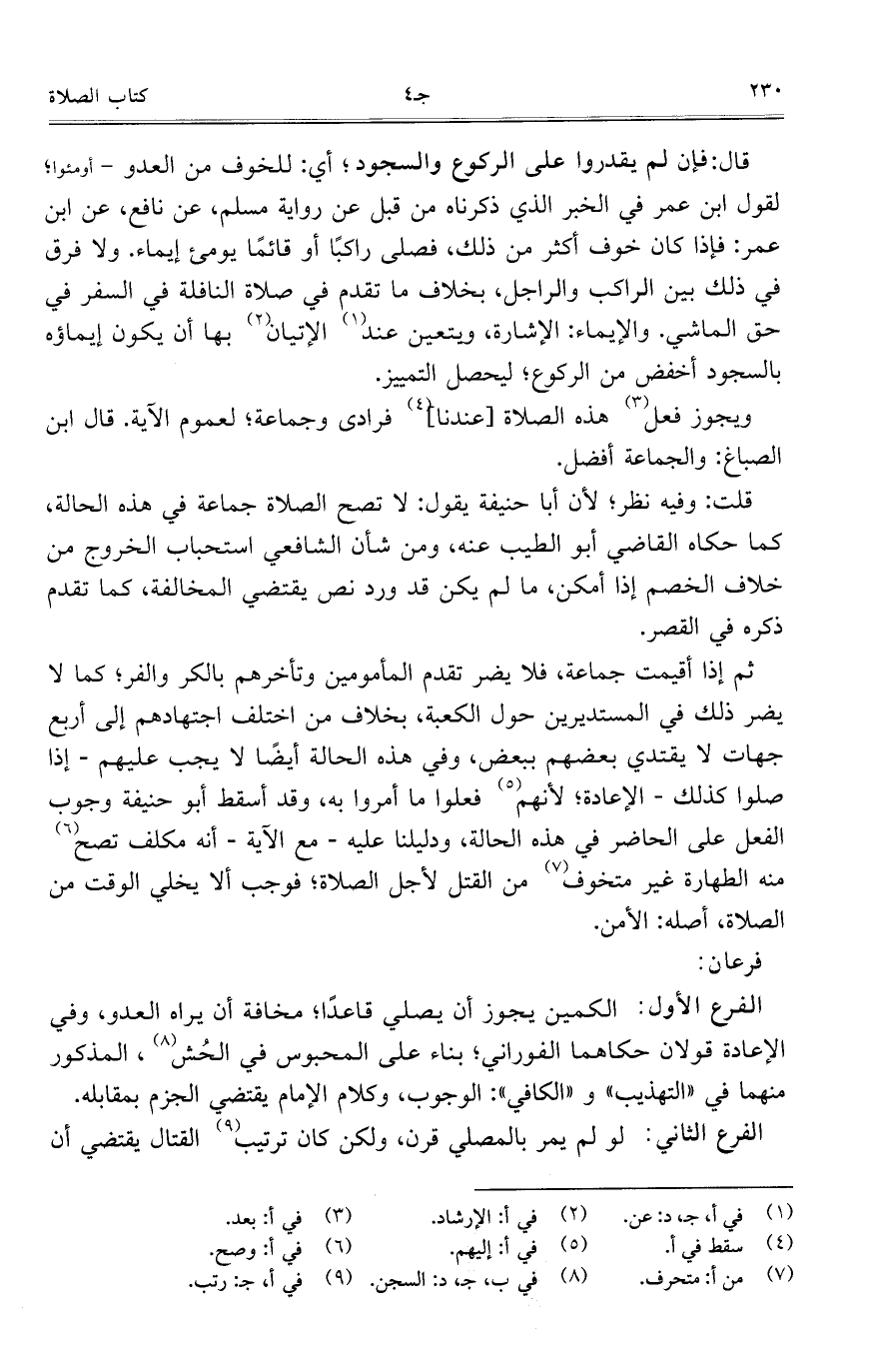 ثم إذا أقيمت جماعة، فلا يضر تقدم المأمومين وتأخرهم بالكر والفر؛ كما لا يضر ذلك في المستديرين حول الكعبة، بخلاف من اختلف اجتهادهم إلى أربع جهات لا يقتدي بعضهم ببعض، وفي هذه الحالة أيضاً لا يجب عليهم- إذا صلوا كذلك- الإعادة؛ لأنهم فعلوما ما أمروا به، وقد أسقط أبو حنيفة وجوب الفعل على الحاضر في هذه الحالة، ولديلنا عليه- مع الآية- أنه مكلف تصح منه الطهارة غير متخوف من القتل لأجل الصلاة؛ فوجب ألا يخلي الوقت من الصلاة، أصله: الأمن.