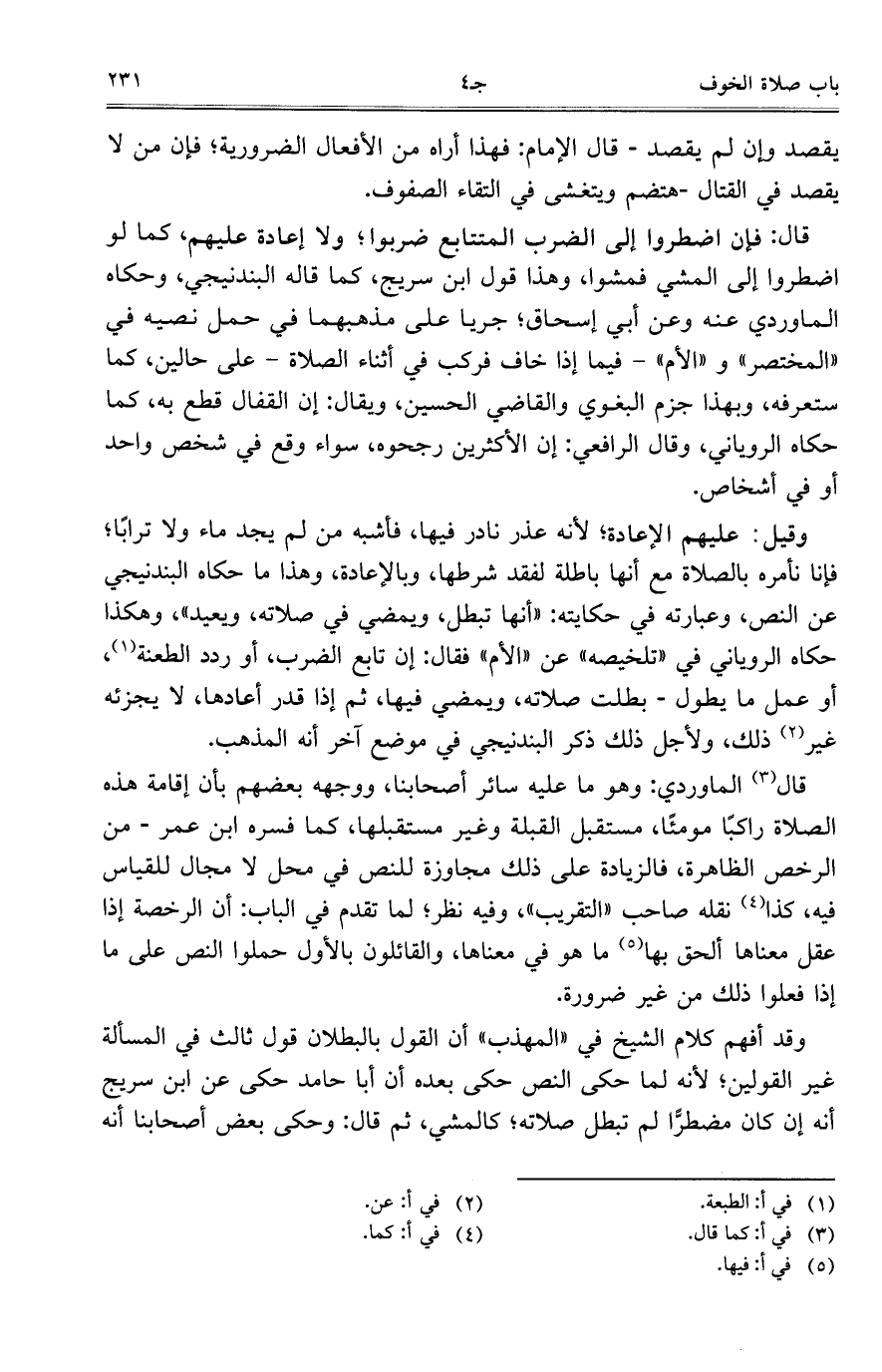 وقيل: عليهم الإعادة؛ لأنه عذر نادر فيها، فأشبه من لم يجد ماء ولا تراباً؛ فإنا نأمره بالصلاة مع أنها باطلة لفقد شرطها، وبالإعادة، وهذا ما حكاه البندنيجي عن النص، وعبارته في حكايته: "أنها تبطل، ويمضي في صلاته، ويعيد"، وهكذا حكاه الروياني في "تلخيصه" عن "الأم" فقال: إن تابع الضرب، أو ردد الطعنة، أو عمل ما يطول- بطلت صلاته، ويمضي فيها، ثم إذا قدر أعادها، لا يجزئه غير ذلك، ولأجل ذلك ذكر البندنيجي في موضع آخر أنه المذهب.
