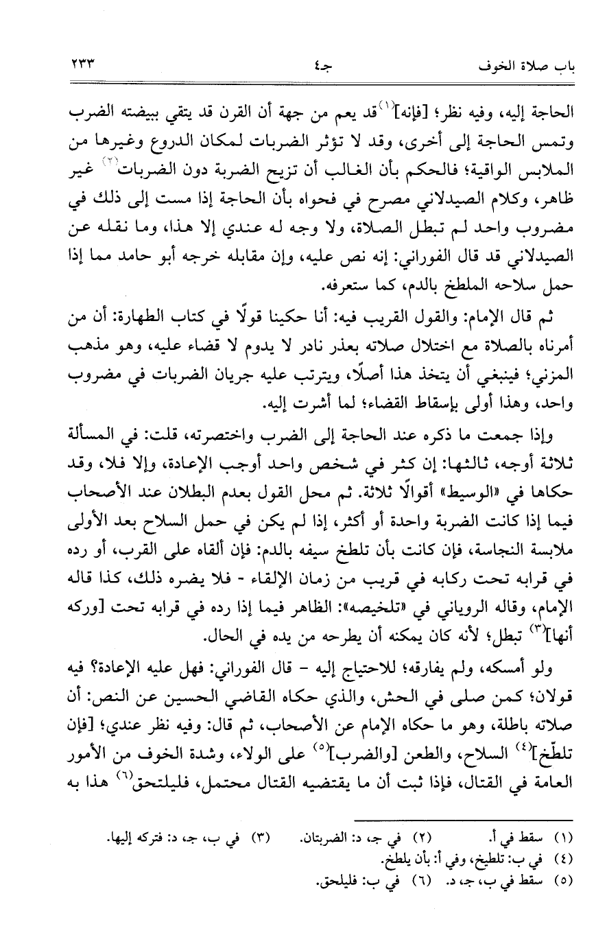 الحاجة إليه، وفيه نظر؛ [فإنه] قد يعم من جهة أن القرن قد يتقي ببيضته الضرب وتمس الحاجة إلى أخرى، وقد لا تؤثر الضربات لمكان الدروع وغيرها من الملابس الواقية؛ فالحكم بأن الغالب ان تزيح الضربة دون الضربات غير ظاهر، وكلام الصيدلاني مصرح في فحواه بأن الحاجة إذا مست إلى ذلك في مضروب واحد لم تبطل الصلاة، ولا وجه له عندي إلا هذا، وما نقله عن الصيدلاني قد قال الفوراني: إنه نص عليه، وإن مقابله خرجه أبو حامد مما إذا حمل سلاحه الملطخ بالدم، كما ستعرفه.